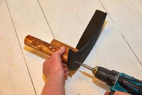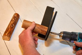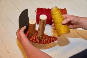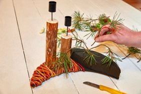 Einen Frischblumensteckschaum-Mond von Smithers-Oasis wässern. Zwei Aststücke auf der Holzunterlage des Steckschaums festschrauben. Sichelspitze mit glitzernden Schnüren umwickeln, dann die Aststücke anbohren und die Halter einstecken. Nun den Steckschaum mit Floralien wie Christrosen, Bergkiefernzweige sowie Bergrosen und Hagebutten bestecken. Zapfen andrahten und in der Basis befestigen. Die Kerzen einstellen und Band am Kerzenhalter anknoten. Einen Stern daran festbinden.