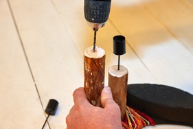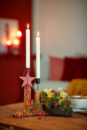 Den Sternenrand des Frischblumensteckschaums von Smithers-Oasis mit wasserfestem Filzmarker nachzeichnen und beschriften. Mithilfe eines scharfen Messers eine Aussparung für das Glas ausschneiden. Den Frischblumensteckschaum wässern und das Glas anschließend mit Heißkleber auf dem Holzuntergrund des Steckschaums festkleben. Nun die Steckbasis mit Kiefernnadeln versehen, Sterne sowie Hagebutten einkleben und das Glas mit Gewürznelken füllen. Nun die Kerze einsetzen. Um das so entstandene Teelicht Schnüre knoten.