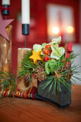 Glitzernde Kordel greift das Funkeln der Sterne auf. Der natürliche Aspekt entsteht durch die Verwendung von Tannengrün, Zapfen sowie Christrosen. Bei den beiden Werkstücken gilt: Weg von konventionellen Adventsgesteckformen – hin zu modernen, trendigen Styles und neuen Formen.