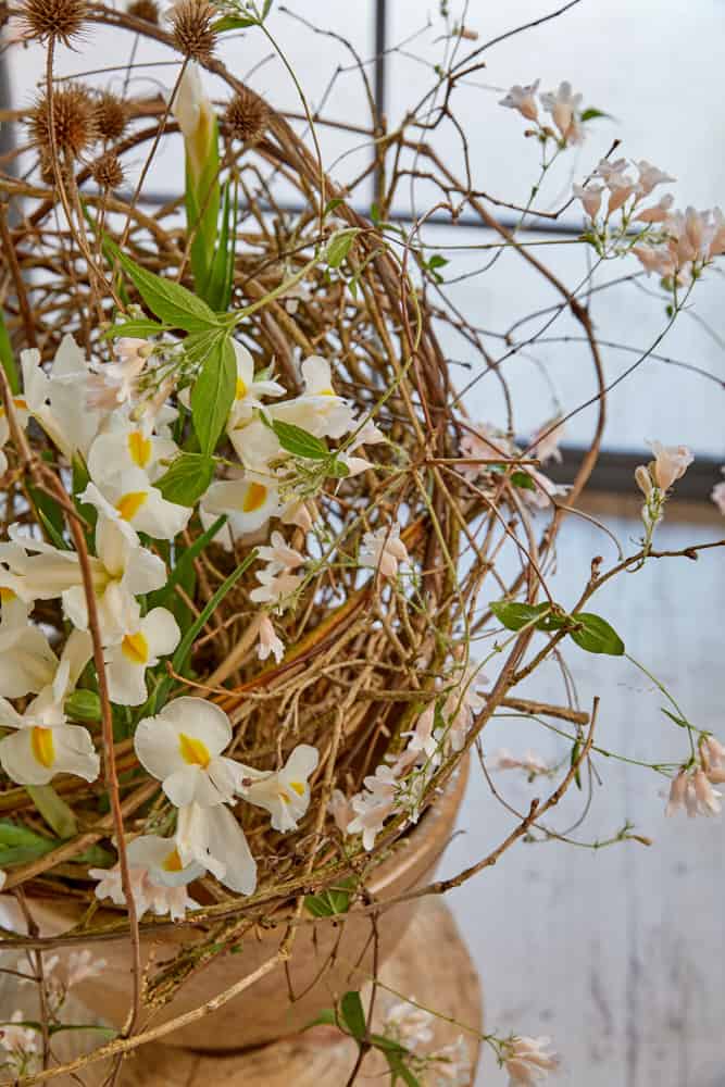 Biegsame Haselbaumzweige umgeben nestartig das Arrangement, aus der in ihrer Einfachheit Kolkwitzie, Kleiner Mannstreu und Iris emporsteigen. Rödeldraht fixiert alles, sodass auch die asymmetrische Platzierung in der weitrandigen Schale möglich wird. Die braune Färbung der Äste in Kombination mit den weißen Blüten ergibt einen harmonischen Einklang und sorgen für eine beruhigende Wirkung. Die Struktur der einzelnen Werkstoffe und ihre natürliche Ausstrahlung machen diese Floristik zu einem Betrachtungsobjekt, bei der die Zeit stehen bleibt.