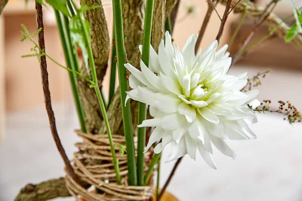 In diesem Werkstück wird die Wertschätzung von natürlichen Materialien betont. Der mit Moos bewachsene Ast, kombiniert mit den imposanten Blüten von Dahlien sowie Levkoje, präsentiert eine zeitlos-klassische Floristik. Die seitlich in der Schale eingeklemmten Zweige und die Schalengestaltung mit Steinen und Freiräumen ist der Natur entlehnt und entspricht dem neuen Ikebana-Style. Dieser ist mit seinen neu interpretierten Techniken modifiziert, einfacher und übertragen auf die hiesigen Gegebenheiten.