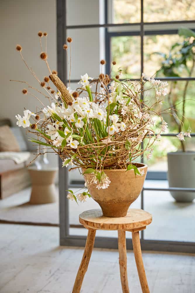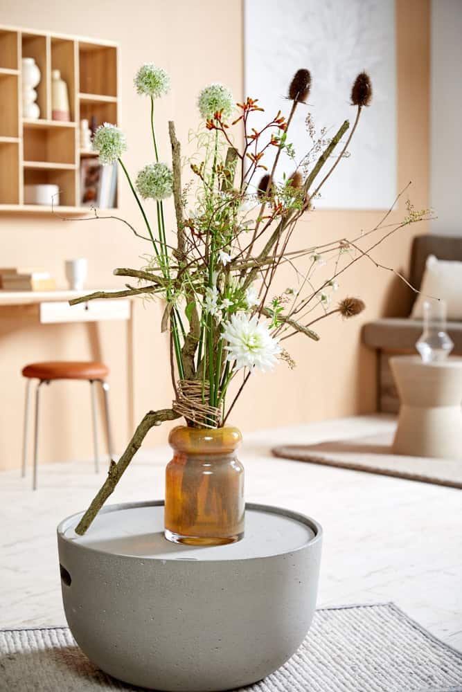 In diesem Werkstück stehen zeitlose, elegante XXL-Blüten im Vordergrund. Sie werden von filigranen Begleitblüten umspielt. Trotz der entgegengesetzten Bewegungsrichtungen strahlt die Floristik Ruhe und Einklang aus. Die natürlichen Materialien in Komposition mit zarten Formen ergeben ein Zusammenspiel aus Leichtigkeit und Weichheit. Wicklungen und der seitliche Ast machen die Vasenfüllung besonders. Nichts ist zu viel, nichts zu wenig, um jedem Bestandteil Raum und Wirkung zu geben.