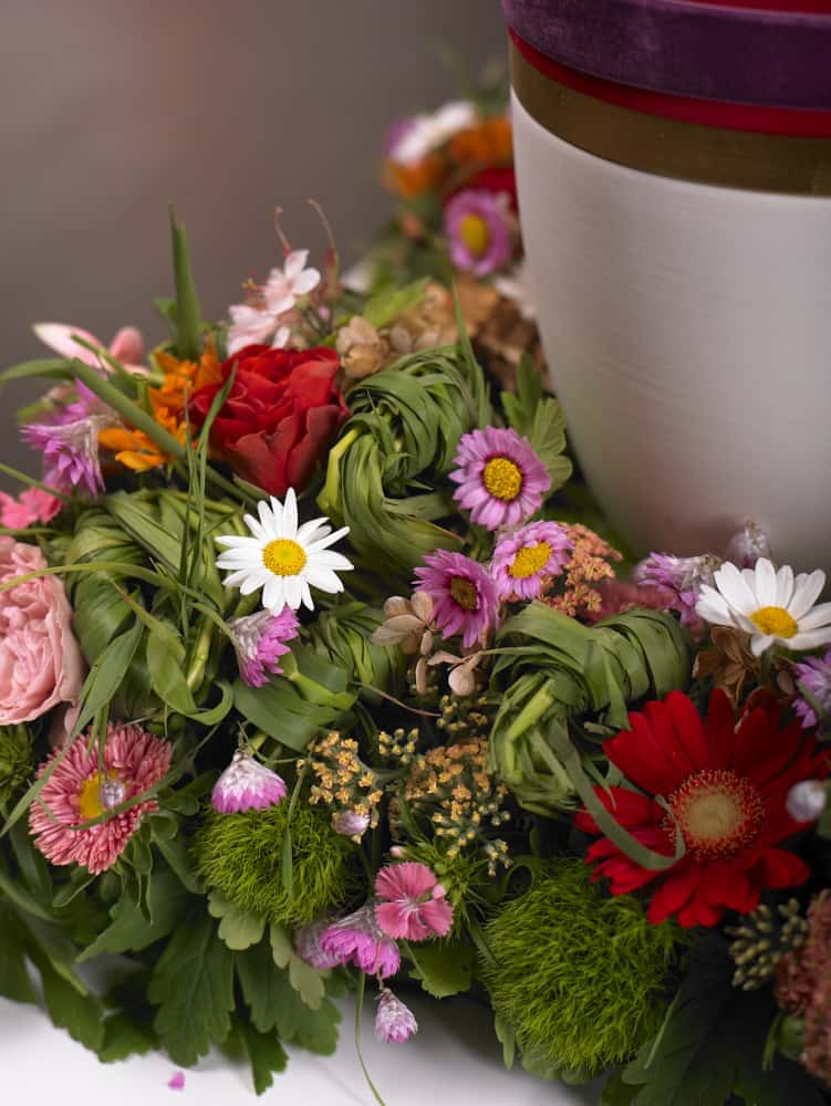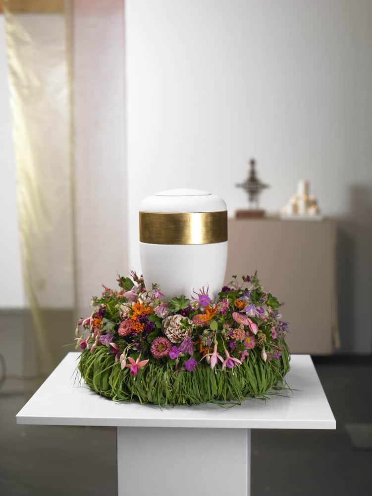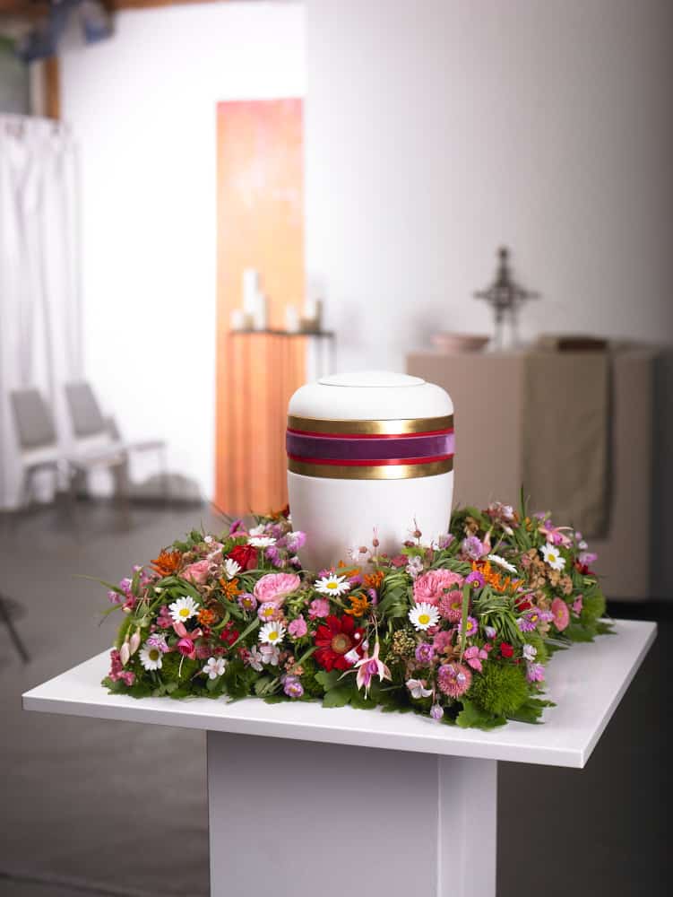 Ein Blumenkissen oder eine Umkränzung aus sommerlichen Blüten, in oder auf dem die Urne bei der Trauer- und Abschiedsfeier eines Verstorbenen positioniert ist, stellt einen tröstlichen Anblick dar. Dabei wird die Urne selbst nicht verdeckt, sondern zeigt sich in ihrer vollen Form und materiellen Ausführung.