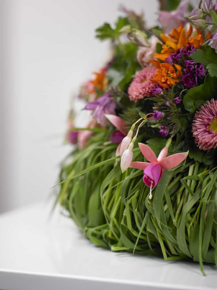 Frische, lange, saftig grüne Wiesengräser sind zunächst radial auf die Strohrömer-Basis gehaftet, bevor der mit den Frischblumen besteckte Frischblumensteckschaum-Ring hier aufgelegt wird. Die Urne selbst steht auf einem kleinen Sockel in Form von aufeinandergelegten Baumscheiben inmitten dieser Doppelkranzes, um die richtige Höhe zu erreichen.