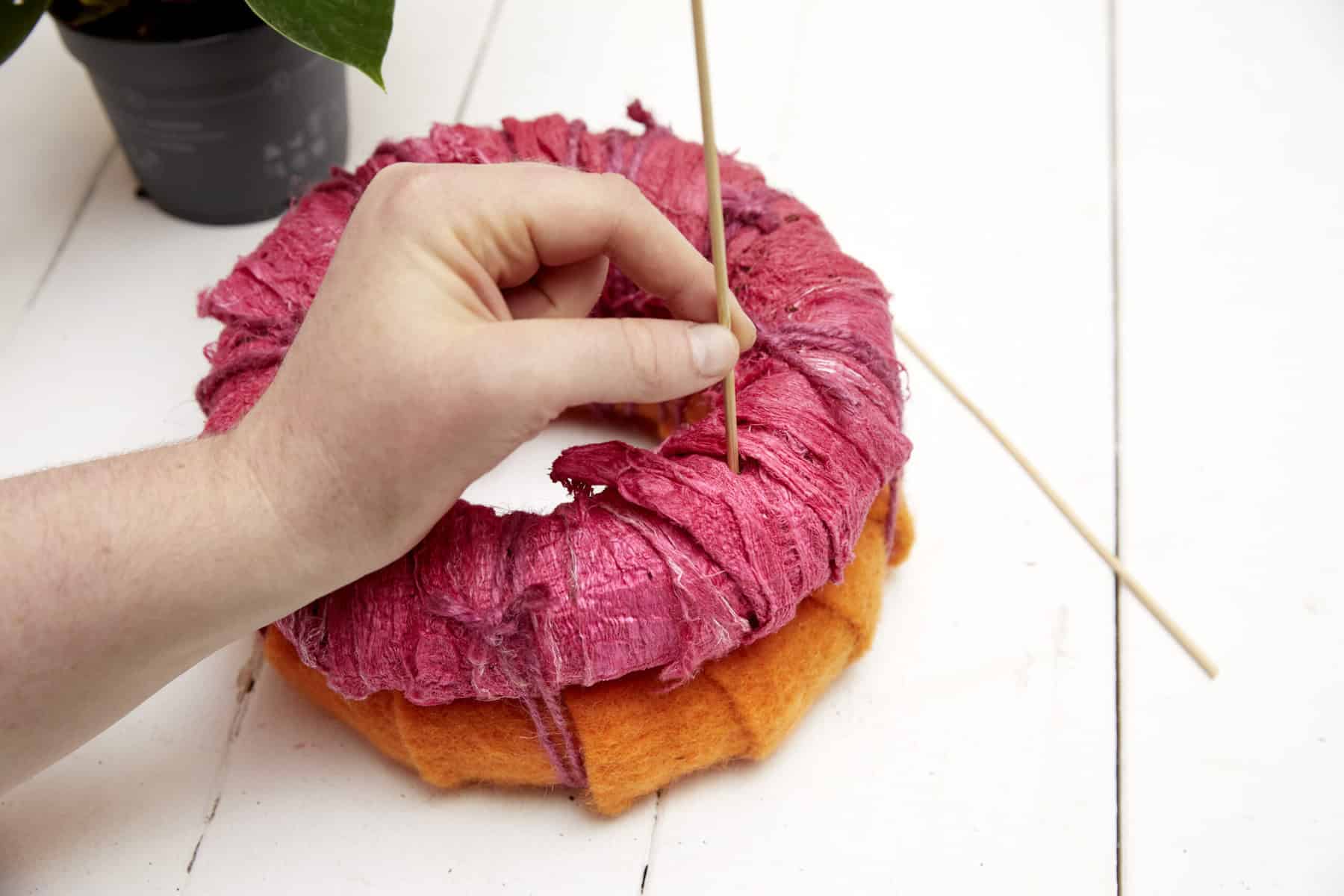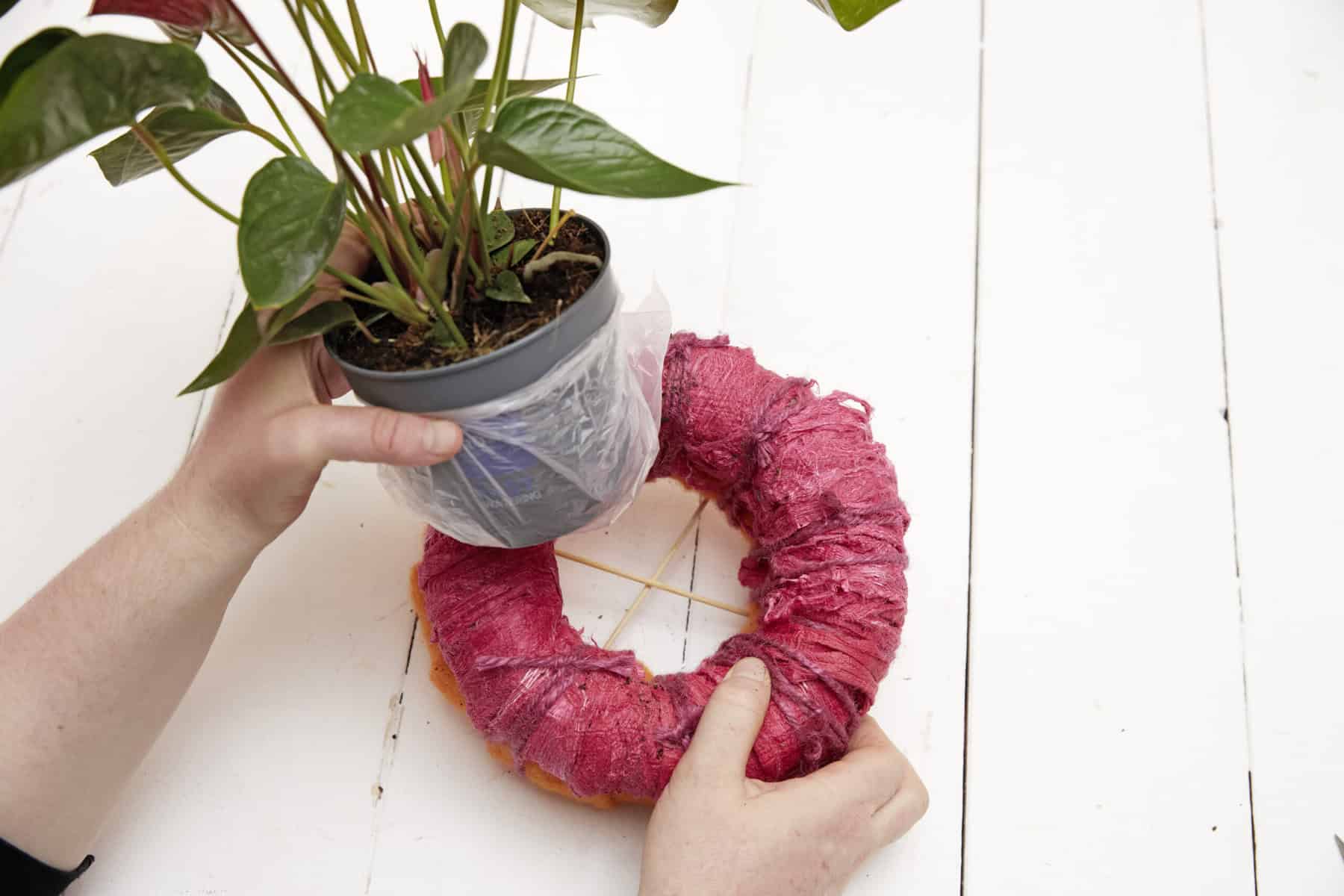 Kranzunterlagen mit Wollschnur umwickeln. Die beiden Kränze aufeinanderlegen und mit Splittstäben verbinden. Splittstäbe über Kreuz in den Kranzboden einstecken, sodass eine Halterung für die Pflanze entsteht. Diese samt Folienbeutel mittig einstellen, dekorieren und das Etikett anbringen.