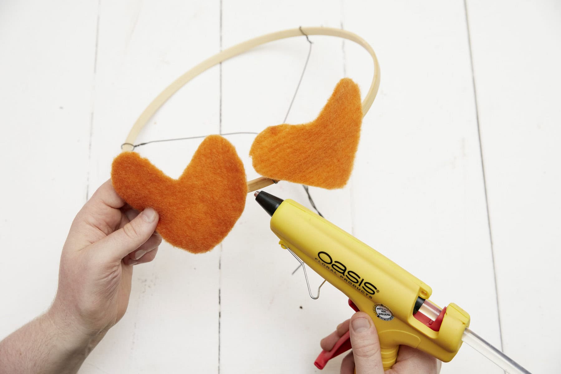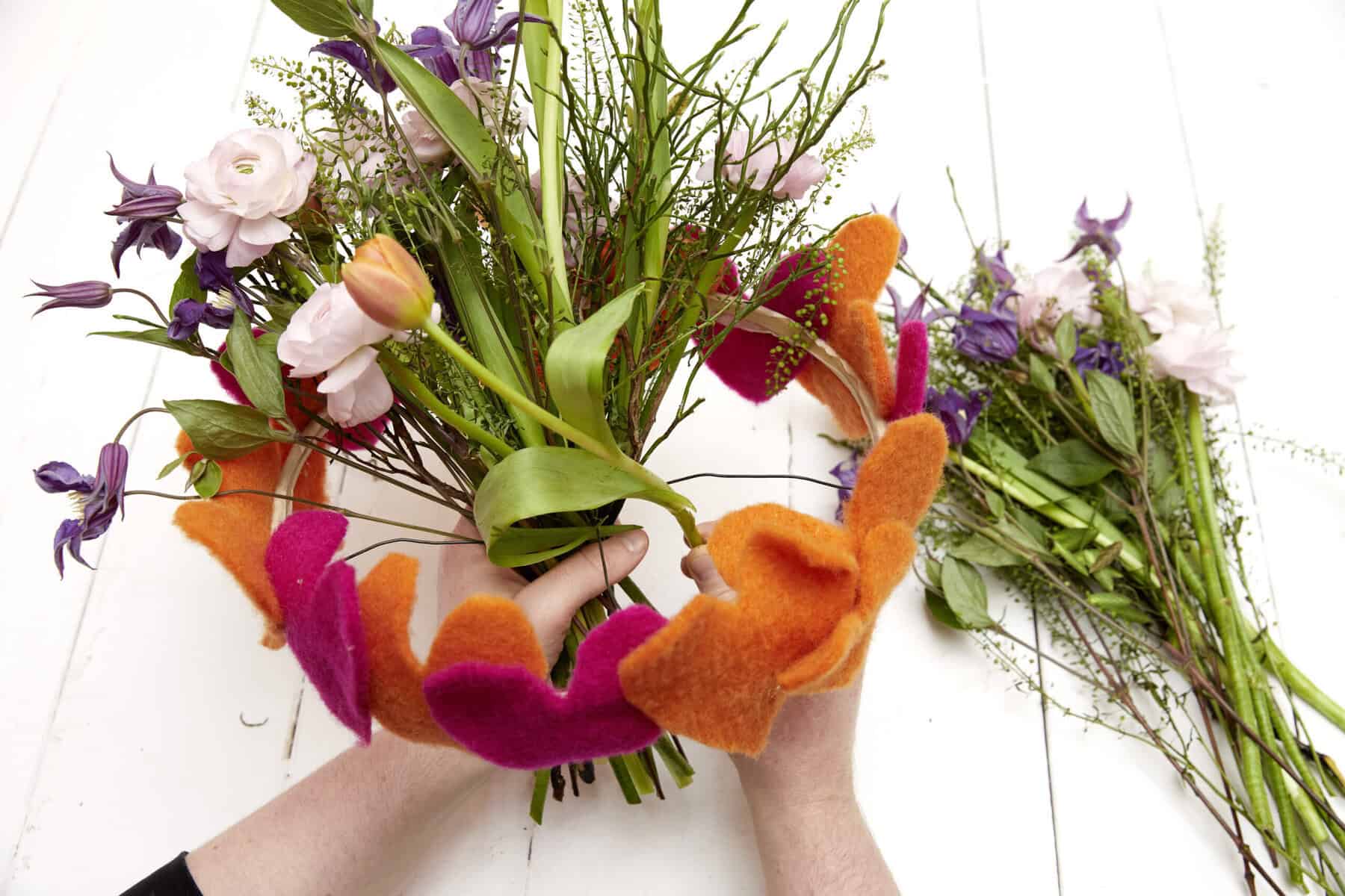 Herzen aus Woll-Filz ausschneiden. Steckdraht mit Flower Tape umwickeln. Den Stickrahmen an drei Stellen mit Steckdraht andrahten und Letzteren zu einer Halterung biegen. Die Filzherzen mittels Heißkleber auf den Stickrahmenring kleben. Abschließend die Floralien in das Grundgerüst, das als alternative Steckhilfe dient, einarbeiten und den Strauß in eine wassergefüllte Vase stellen.
