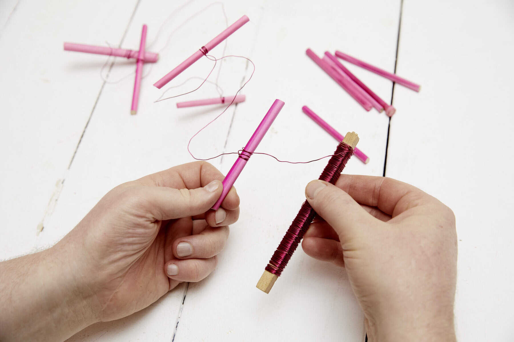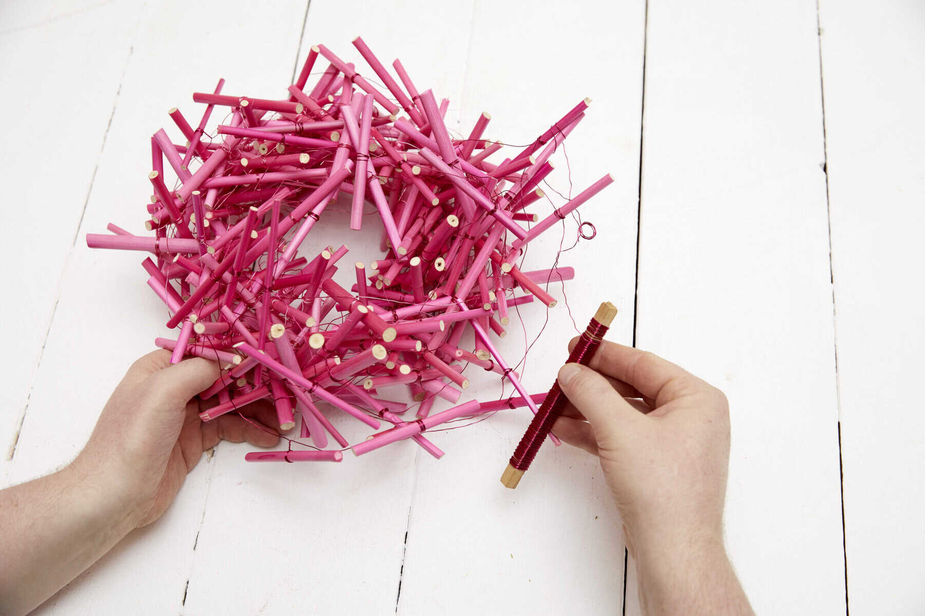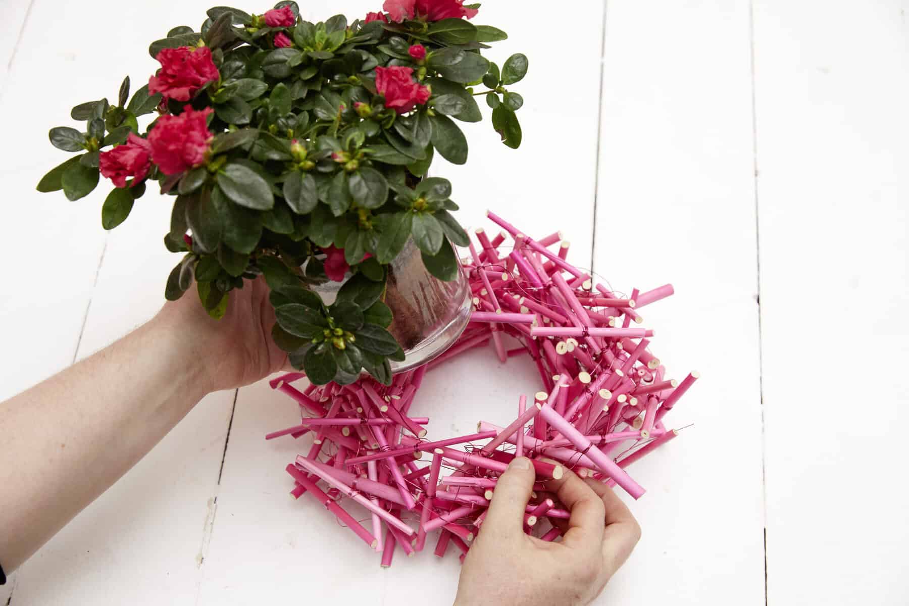 Gefärbte Holzstäbe in die gewünschte Länge schneiden und die Stücke mithilfe von Zierdraht zu mehreren langen Ketten andrahten. Die angefertigten Ketten zu einem Nest winden. Pflanze samt Glasgefäß mittig im Nest platzieren. Aus Curley Moos ein Herz formen und mit Zierdraht fixieren. Steckdraht daran befestigen, Band anknoten, ggf. Etikett anklemmen und ins Werkstück einarbeiten.