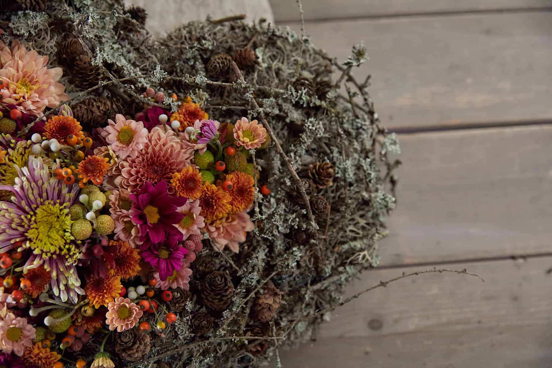 Hoffnungsvolle Worte in Englisch oder Deutsch haften an diesem Arrangement. Es basiert auf einem mit Flechten- und Lärchenzweigen mittels Twistdraht verkleideten Drahtkorb. Mittendrin als auch untendrunter finden sich jeweils Baumscheiben, die mit Schrauben aneinander und am Korb fixiert sind. Der gewässerte Frischblumensteckschaum wird eingesetzt und mit den Chrysanthemen sowie weiteren Blumen besteckt.