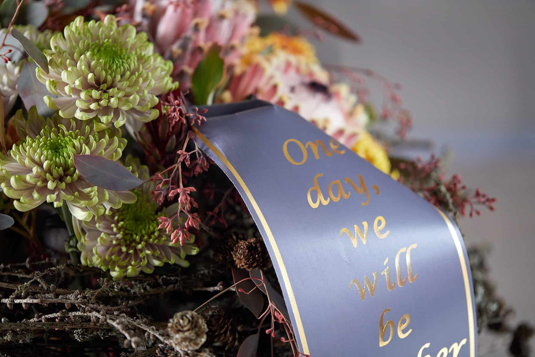 Wir zeigen euch hochwertig bedruckte und verarbeitete Trauerschleifen, die nicht nur die persönlichen Abschiedsworte zum Ausdruck bringen, sondern auch die Wertigkeit der handwerklich angefertigten Trauergestecke betonen.