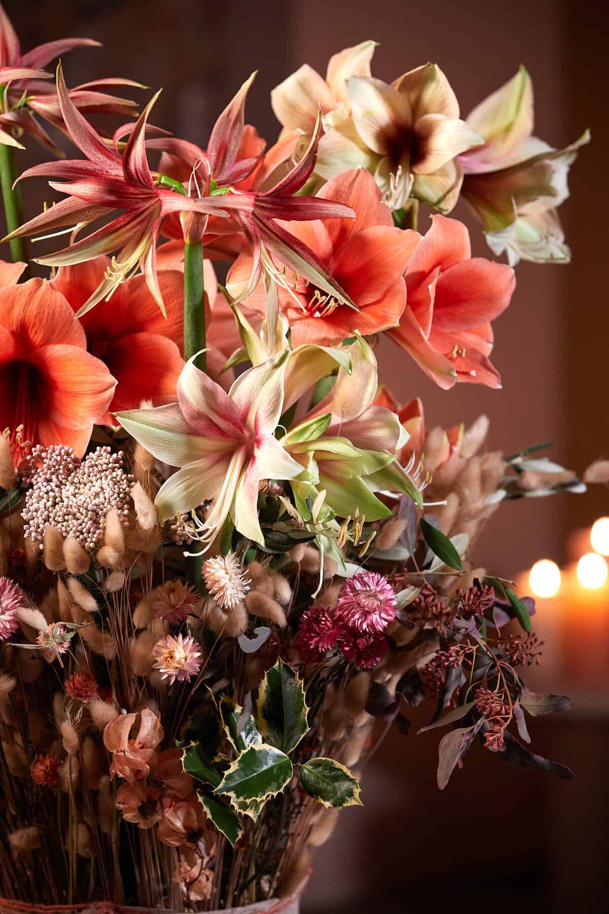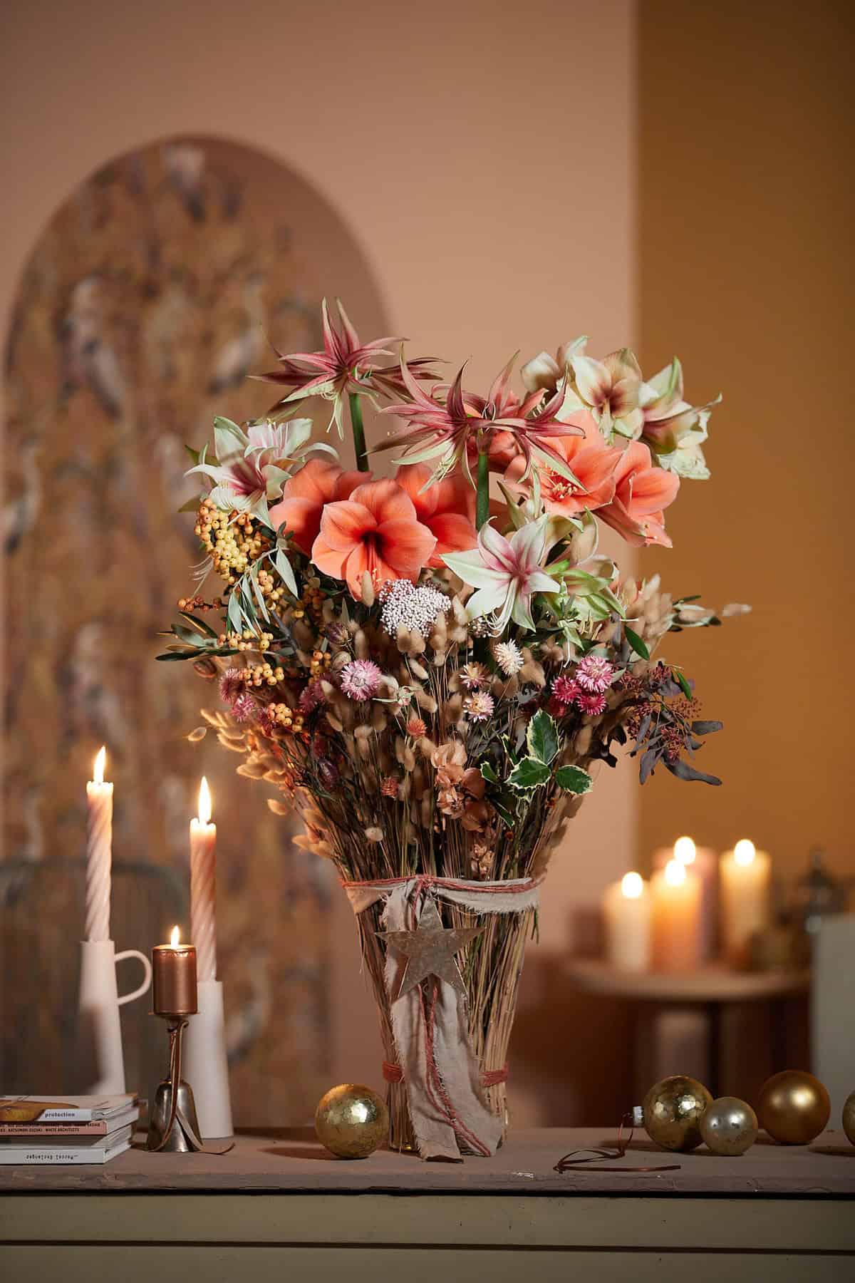 Durch sein großes Blüten- und Farbspektrum gehört der Ritterstern zu den beliebtesten Blumen in der Winter- und Weihnachtszeit. Die pastellfarbenen Blütenmischungen der Amaryllis Gruppe versprühen Leichtigkeit in der dunklen und kalten Winterzeit. In Kombination mit aktuellen Trockenblumen bekommen die langstieligen Blüten weihnachtlichen Charme. Im Video zeigt euch BLOOM’s Floristin Dorothea Hamm, wie ihr die Weihnachtsfloristik mit Floralien von Amaryllis anfertigt.