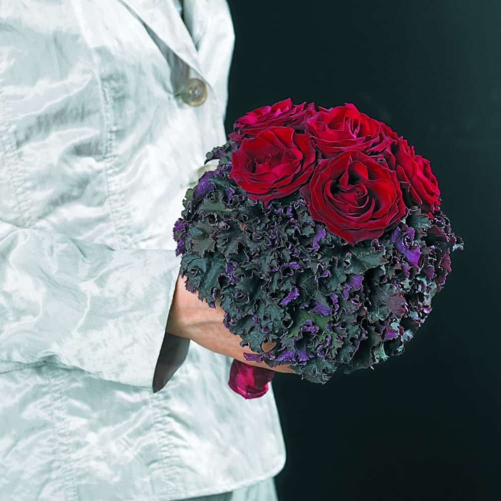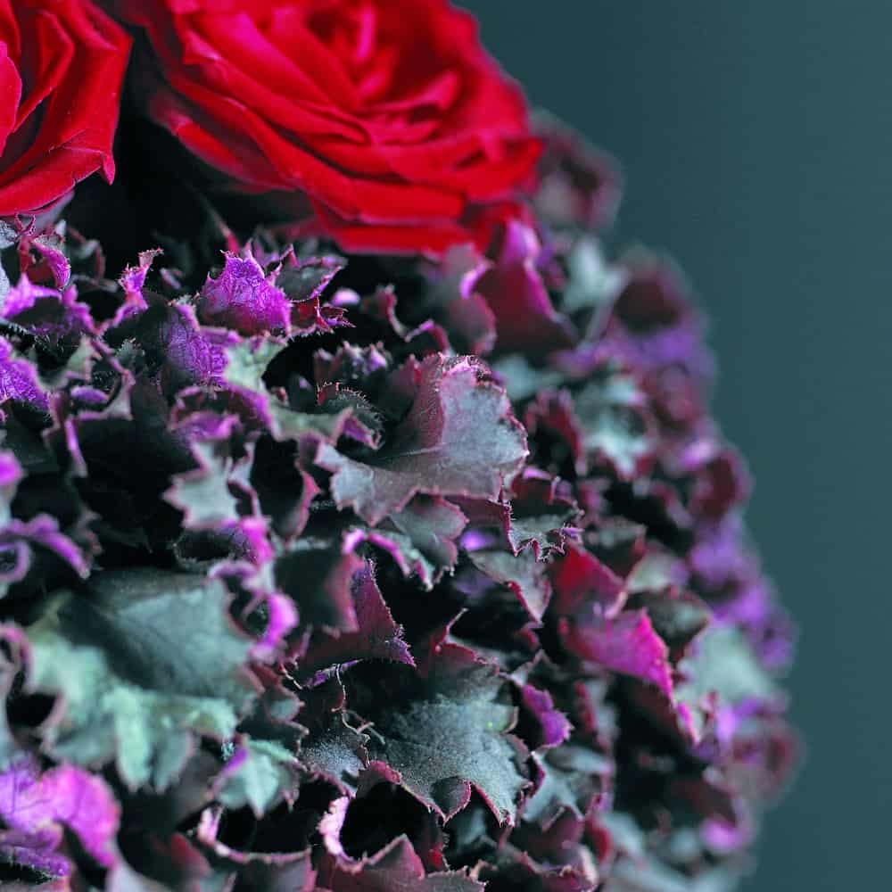 In diesem Brautschmuck finden sich magentarote Unterseiten von Blättern von Heuchera purpurea. Sie reflektieren die von oben auf das Blatt treffenden Sonnenstrahlen in den entsprechenden Wellenbereichen und differenzieren so das Licht in die verschiedenen Wellenbereiche, so auch in den vom Blattgrün nutzbaren Lichtbereich. Für die floristische Gestaltung dieses Kugelbrautstraußes steht allerdings die optische schmückende Wirkung der Blattunterseiten, hier in Kombination mit verschwärzlichtem Rot, im Vordergrund.