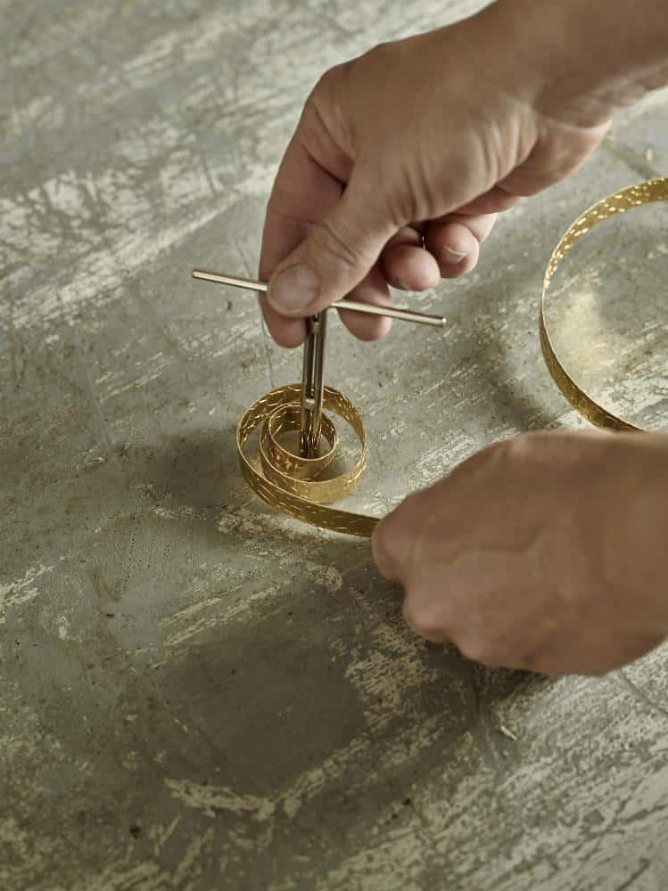 1. Aus Aluminium-Flachdraht mithilfe der Draht-Biegehilfe Schnecken drehen und diese mit Schnur innerhalb des kleineren Gestaltungsrahmens aneinanderknoten.