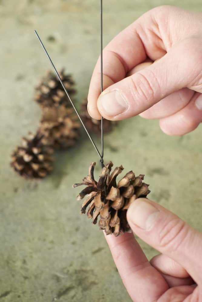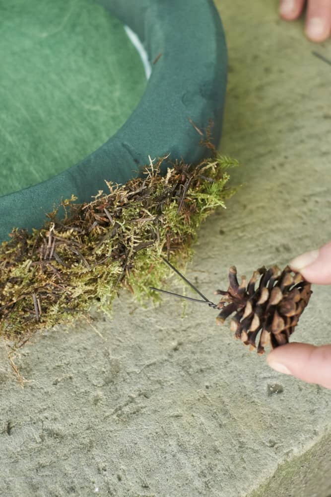 - Die Kiefernzapfen werden für einen flächig wirkenden Rand der Kreisgestaltung an ihren Spitzen angedrahtet, so dass sie im fertigen Werkstück die Unterseiten zeigen.