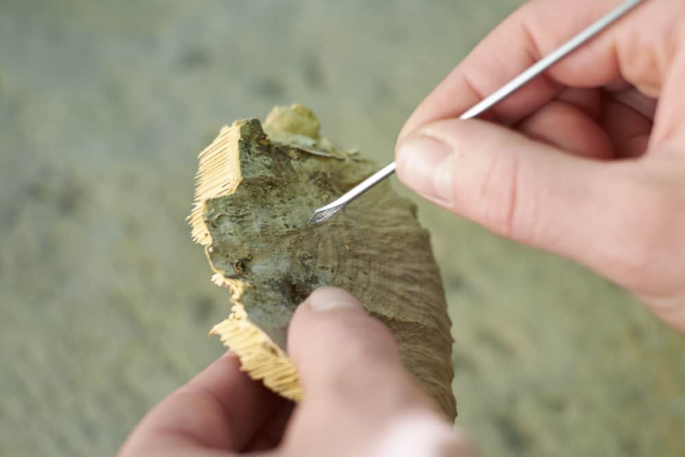 Die zähen, trockenen Baumpilze werden zunächst an zwei relativ eng nebeneinanderliegenden Stellen durchbohrt.