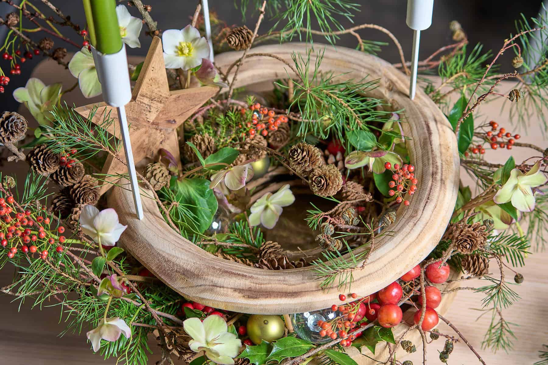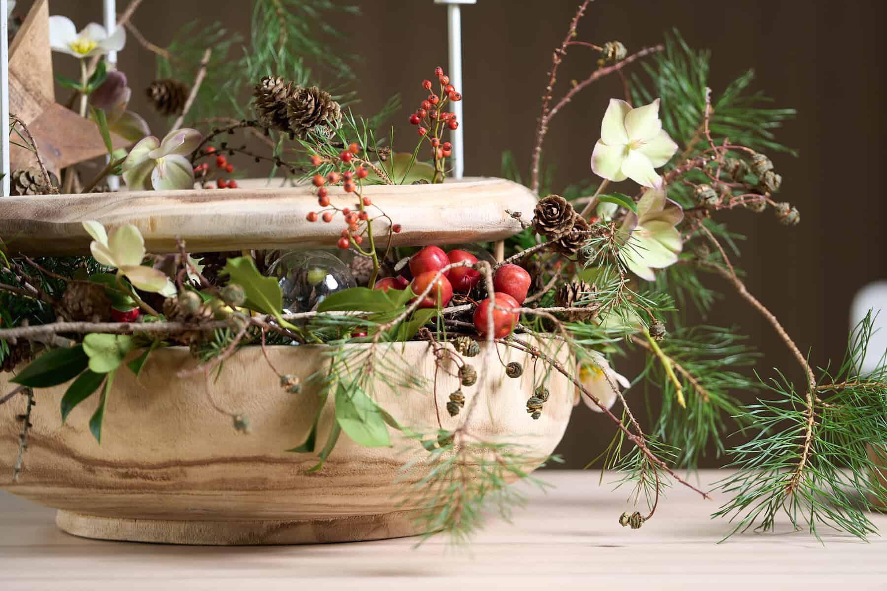 Glanz und Glitter lassen sich hier nicht finden, stattdessen präsentiert sich die heimische Natur in Hülle und Fülle. Zwischen viel Grün, Zapfen und kleinteiligen Beeren zeigen sich leicht geöffnete Knospen der sternförmigen Blüten von Hippeastrum. Die bereits opulente Gestaltung erwartet noch ihre vollständige Blütenpracht und wird lediglich von einer filigranen und simpel angebrachten Baumkerze beleuchtet.