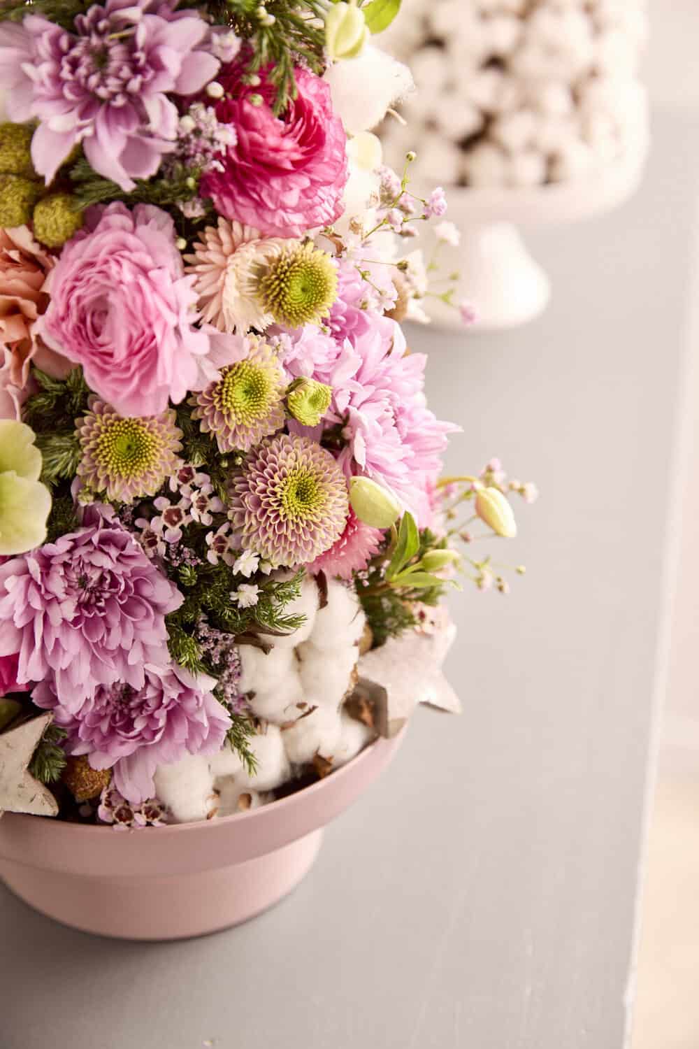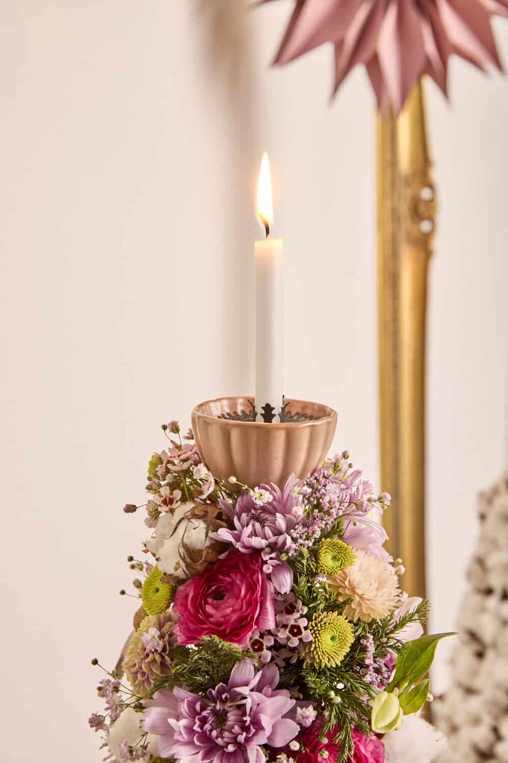 Auch beim alternativen Tannenbaum darf es bei diesem Trend nicht an Hülle und Fülle von detailreichen Blüten fehlen. Eine Kuchenplatte dient als Basis für den gewässerter Frischblumensteckschaum-Kegel, welcher es möglich macht, schnell und unaufwändig die Blumen einzustecken. Als Spitze dient eine einzige filigrane Stabkerze.