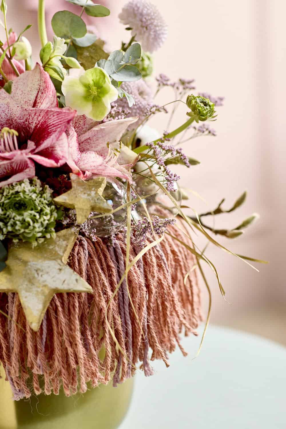 Ein asymmetrisches Grundgerüst aus stark verzweigten Magnolienzweigen umgibt die filigrane Mitte aus kleinteiligen Blüten und Mohnkapseln. Schmuckaccessoires wie Papierornamenten unterstreichen die feminine Seite dieser weihnachtlichen Vasenfüllung im angesagten Trend.