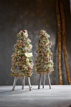 Die beiden himmelwärts deutenden Kegelformen basieren auf Formen aus Weidenzweigen, Ranken, Gras und Wickeldraht, auf die die weiteren Werkstoffe gewickelt oder geklebt wurden. Ein frischer Akzent kann mittels angebundenem Glaswasserröhrchen hinzugefügt und jederzeit erneuert werden. Die Zweigfüße werden auf dem Grab für einen sicheren Stand in die Erde gesteckt.