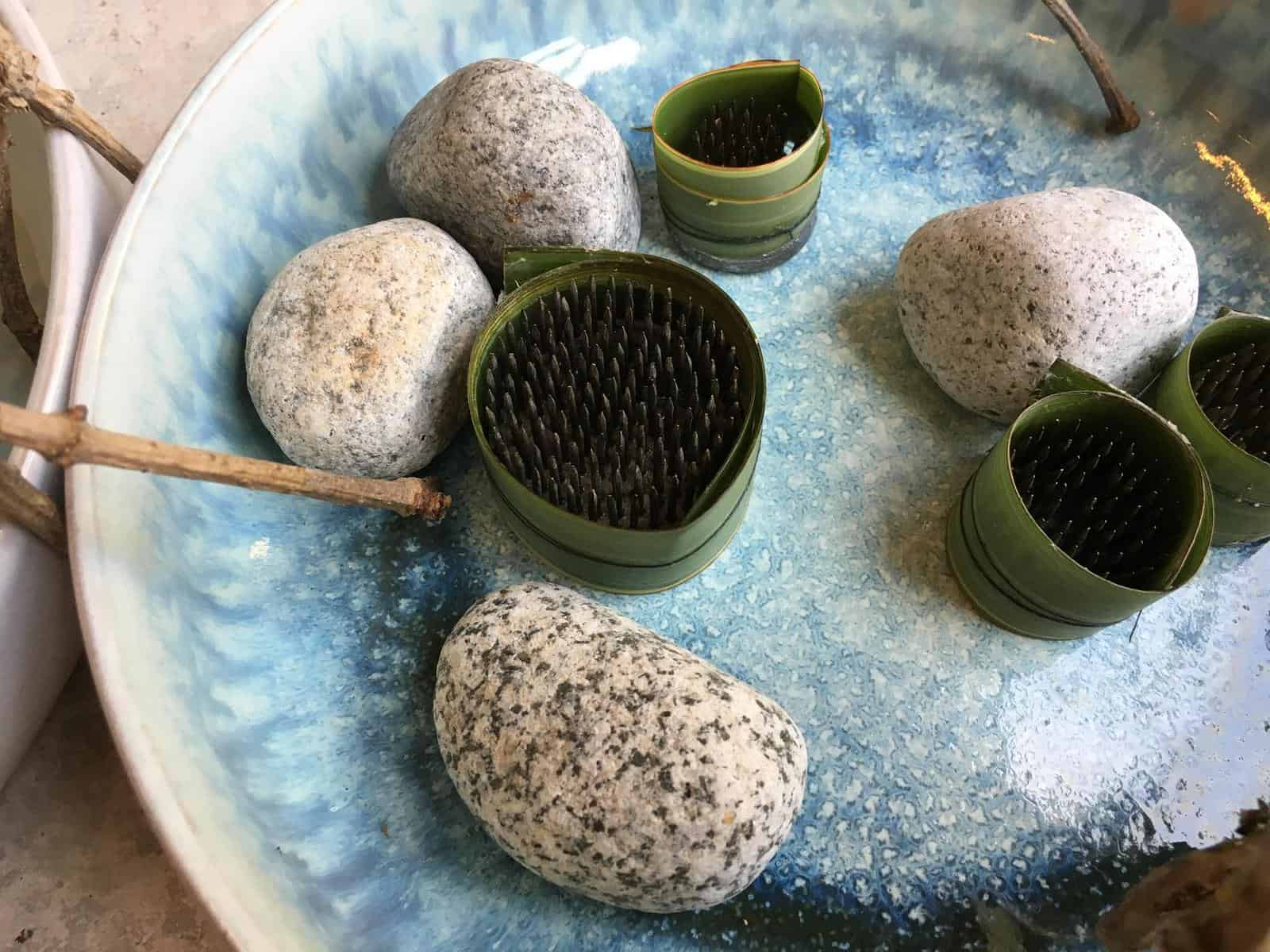 Den Steckigel (Kenzan) mit einem Phormiumblatt ummanteln, mithilfe von Zierdraht fixieren und in die mit etwas Wasser befüllte Schale platzieren. Holunderzweige kopfüber hineinsetzen und die Gefäße an einer Astgabelung miteinander verbinden. Zum Schluss die Floralien einstecken und das Werkstück mit Muschelgehäusen und Steinen umspielen, die eine natürliche Landschaft adaptieren und technische Details kaschieren.