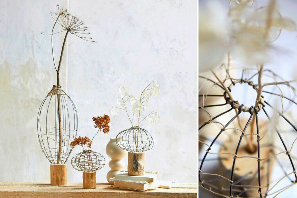 Diese rustikalen Drahtvasen strahlen dank ihrer Natürlichkeit eine beruhigende Eleganz aus. Wie die kunstvollen Objekte mit Floralien und Draht von BUCO gestaltet werden, zeigen wir euch hier. Das braucht ihr: Riesenbärenklau...