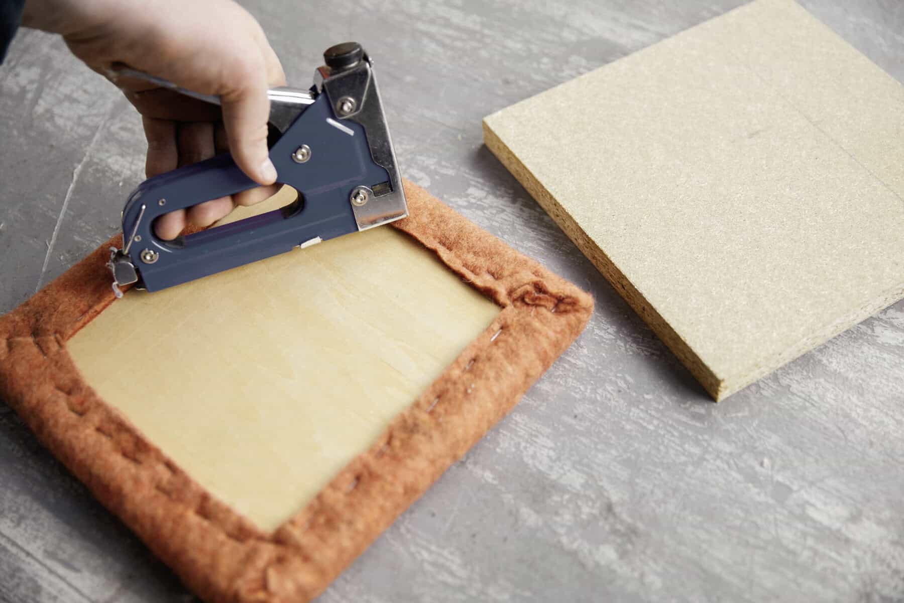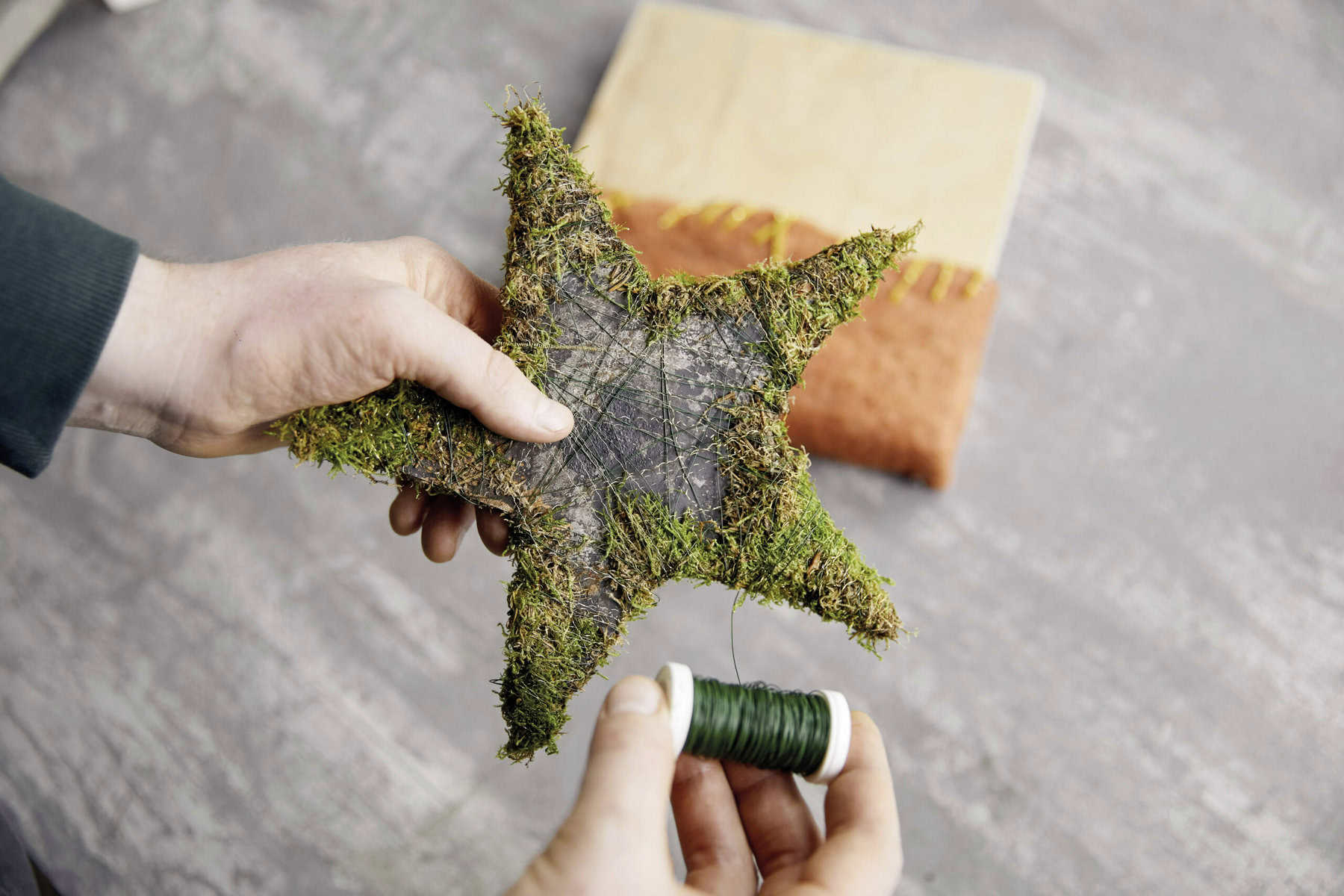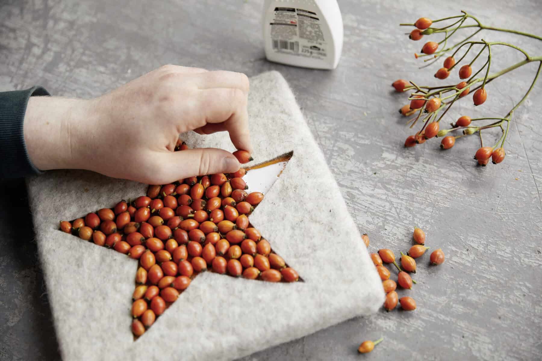 Die Holzquadrate zum Teil mit Wolle betackern, roh belassen oder mit Moos bewickeln. Wollfilz-Sterne ausschneiden und auf die Bretter kleben. Nun dekorieren: entweder Hagebutten mit Holzleim in Sternform aufkleben oder Sternform mit Moos bewickeln und auf die Holzplatte kleben. Den Filzstern an den Spitzen mit je zwei, drei Piniennadeln bewickeln.
