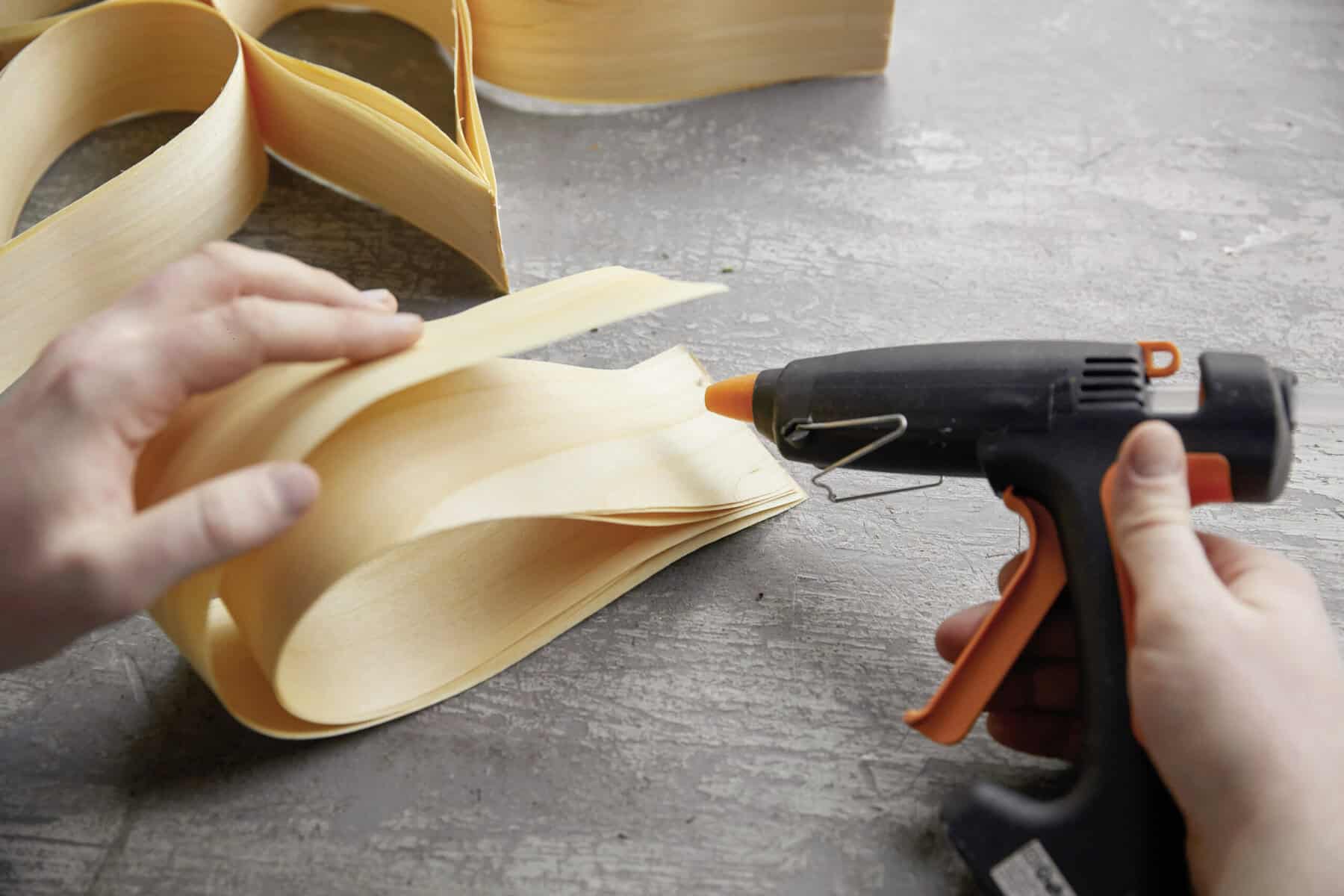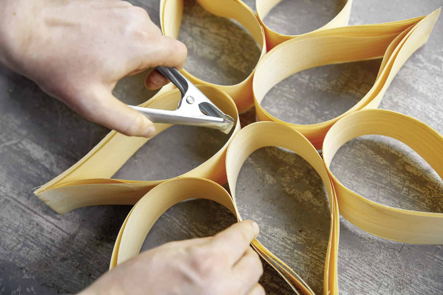 Furnier in Streifen schneiden. Mehrere Streifen zu einem Tropfen zusammenkleben. Erst vier mit ihren Breitseiten, dann in deren Zwischenräumen vier weitere Tropfen zu einem Stern zusammenkleben. Dabei erst mit Klemmen fixieren, bis der Kleber getrocknet ist. Lochöse einstanzen und Band zum Aufhängen durchziehen. Nach Wunsch die Innenräume einzelner Tropfen mit Floralien füllen.