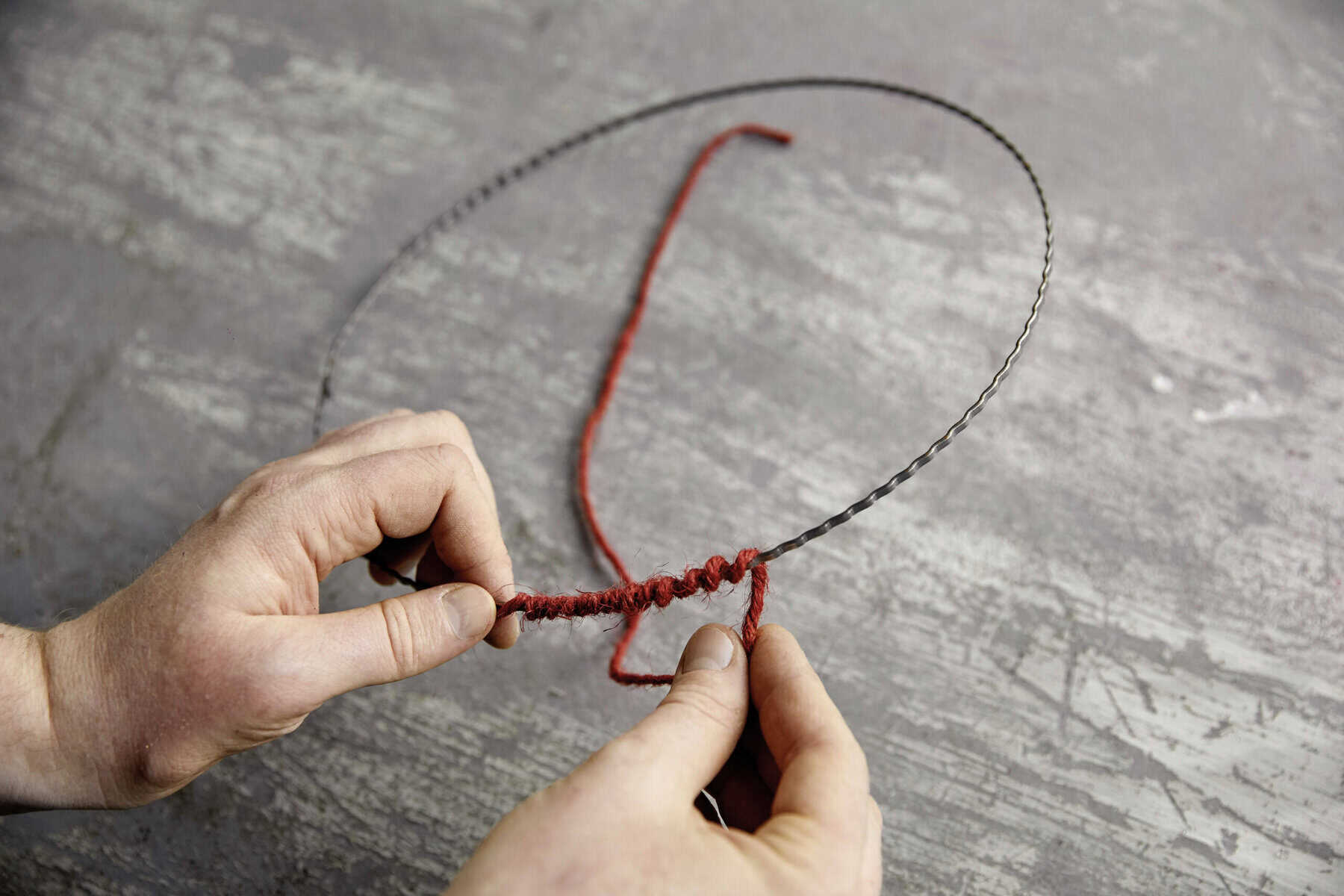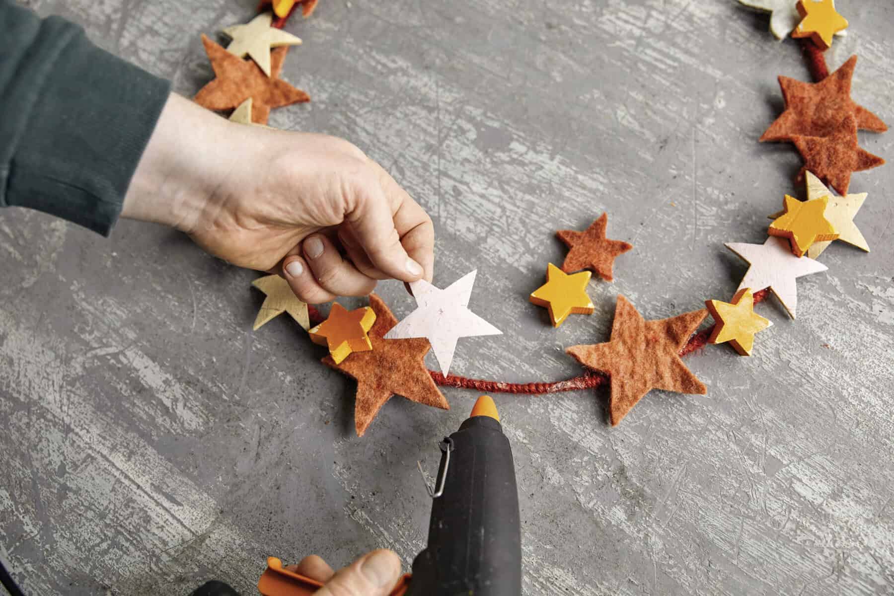Einen Gestaltungsring mit Sicheltanne bewickeln. Einen zweiten Wellendrahtring zunächst mit Schnur bewickeln. Dann mittels Heißkleber mit den aus Wollfilz ausgeschnittenen Sternen im Wechsel mit verschiedenen Holzsternen bekleben. Den Sternenkranz mit Trockenranken auf den Grünkranz binden.