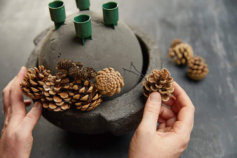 Die Trockenblumensteckschaum-Kugel in die Schale legen. Achtet darauf, dass der Rand hoch genug ist, damit sie nicht verrutschen kann. Kerzenhalter platzieren. Die Zapfen mithilfe von Steckdraht einstecken. Die Clematis-Ranken um das Gesteck winden. Den Wellendrahtring mit Schnur abwickeln, leicht schräg auf die Kugel setzen und mittels Wickeldraht punktuell befestigen. Deko-Anhänger mit Schnur anknoten, die Kiefernnadeln zu einem Bündel zusammennehmen und ebenfalls anbringen.