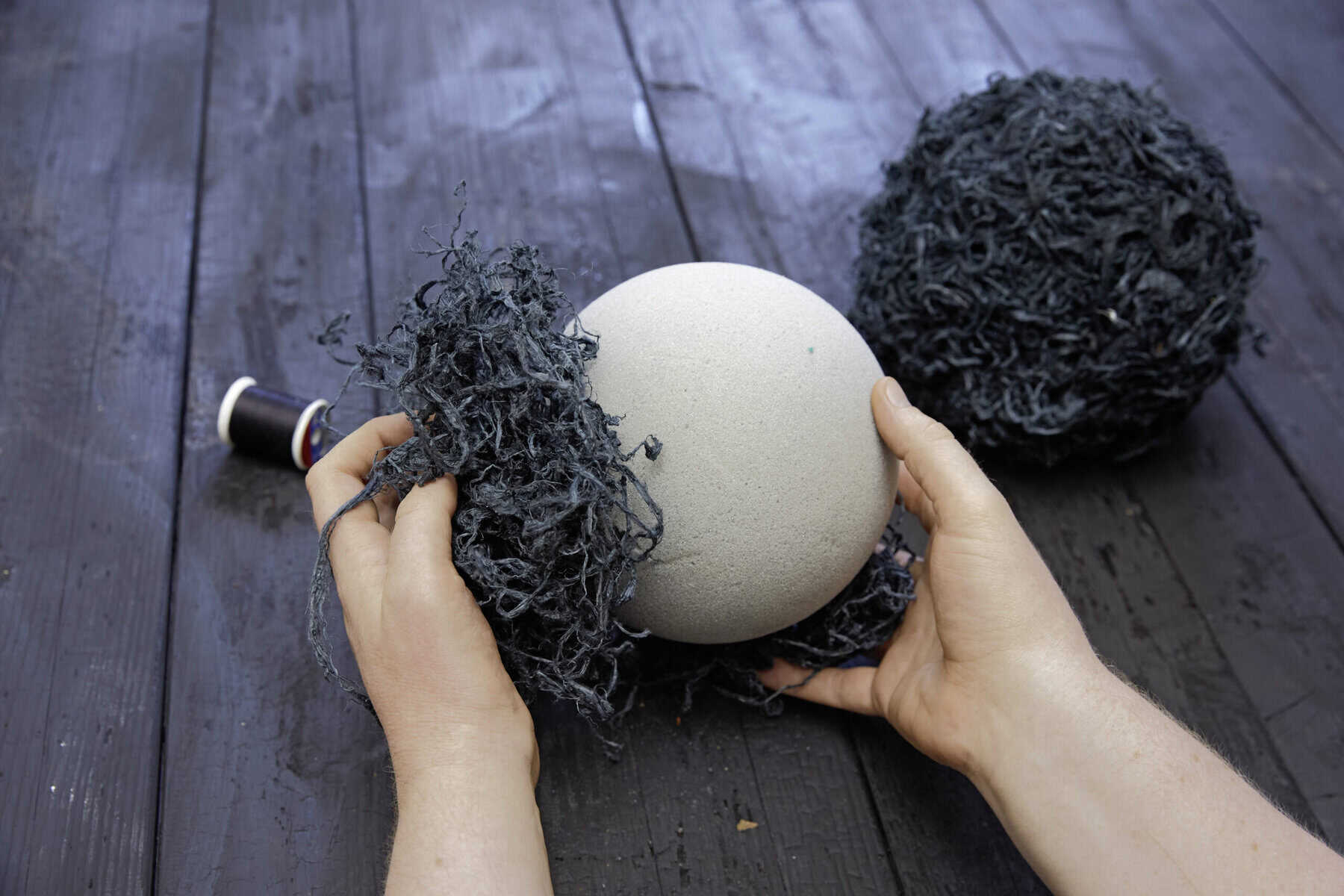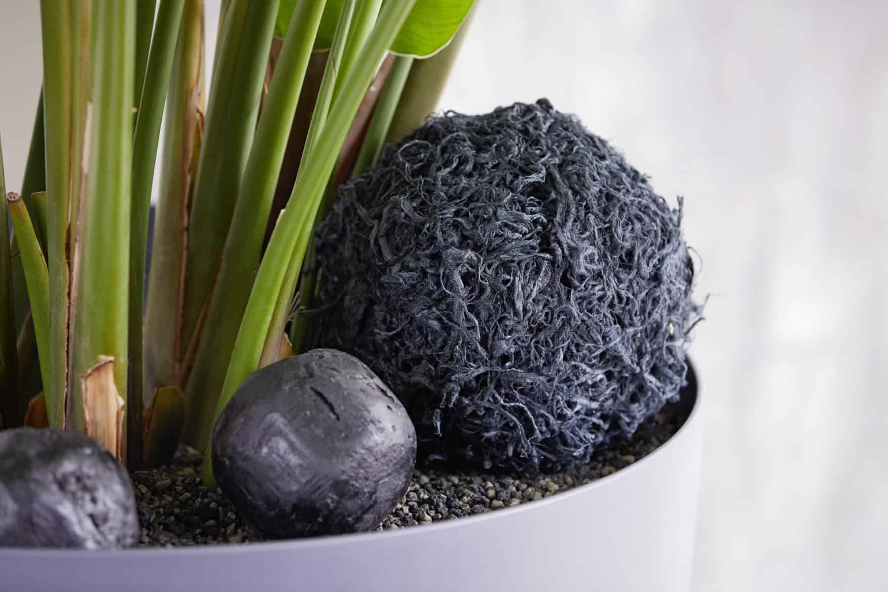 Maulbeerbaumrinde um die Trockenblumensteckschaum-Kugel legen. Mit Nähgarn fixieren, sodass die Kugel rundherum bedeckt ist. Die fertige Kugel im Pflanzgefäß platzieren.