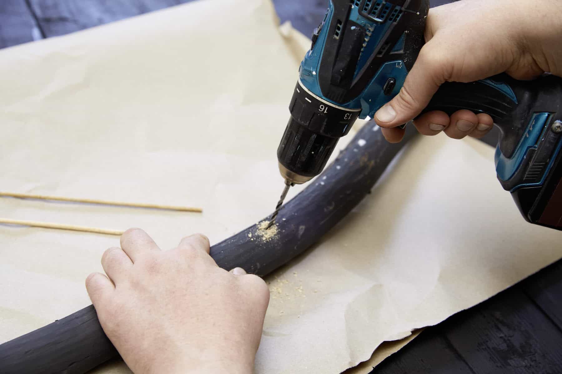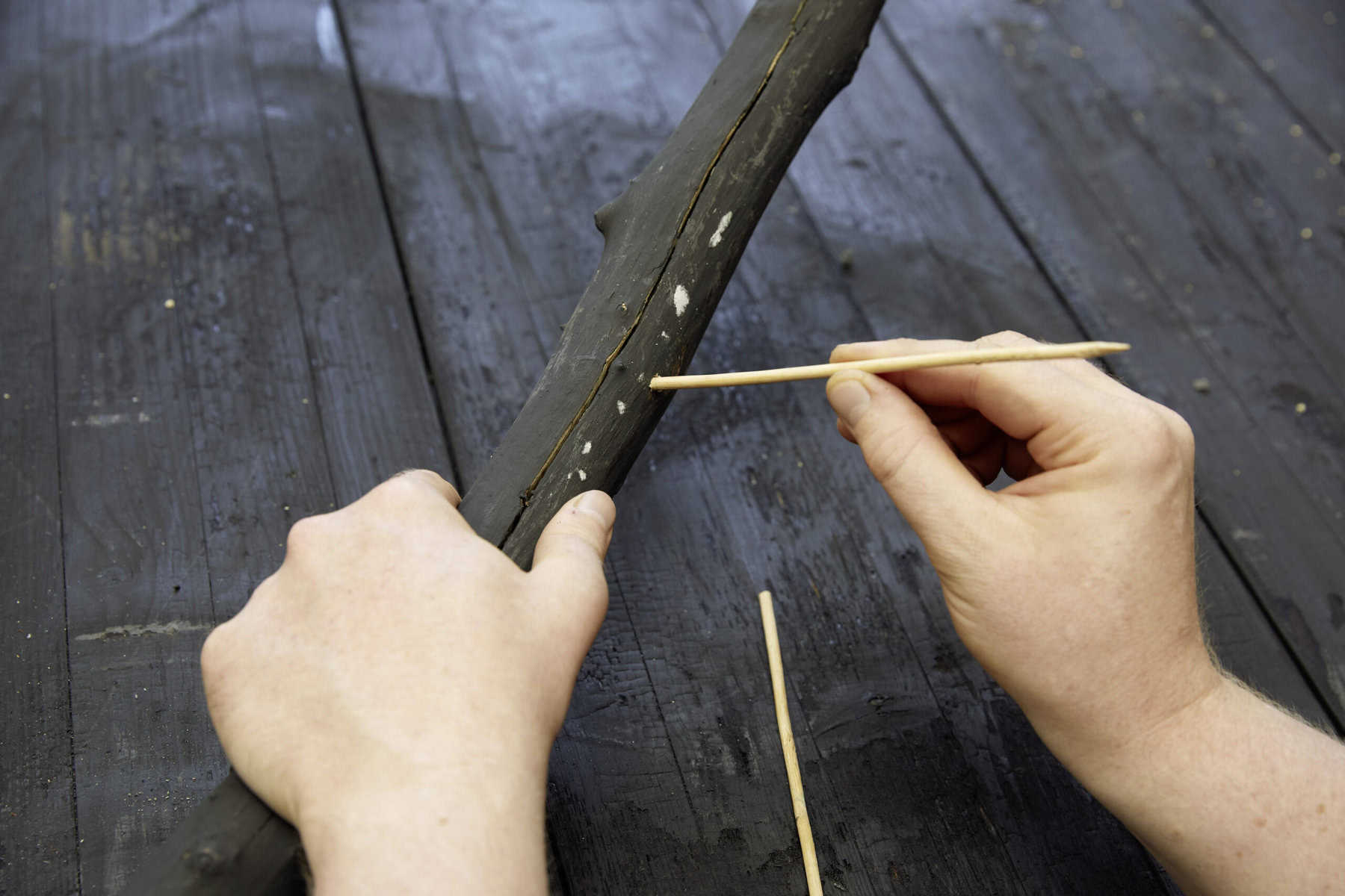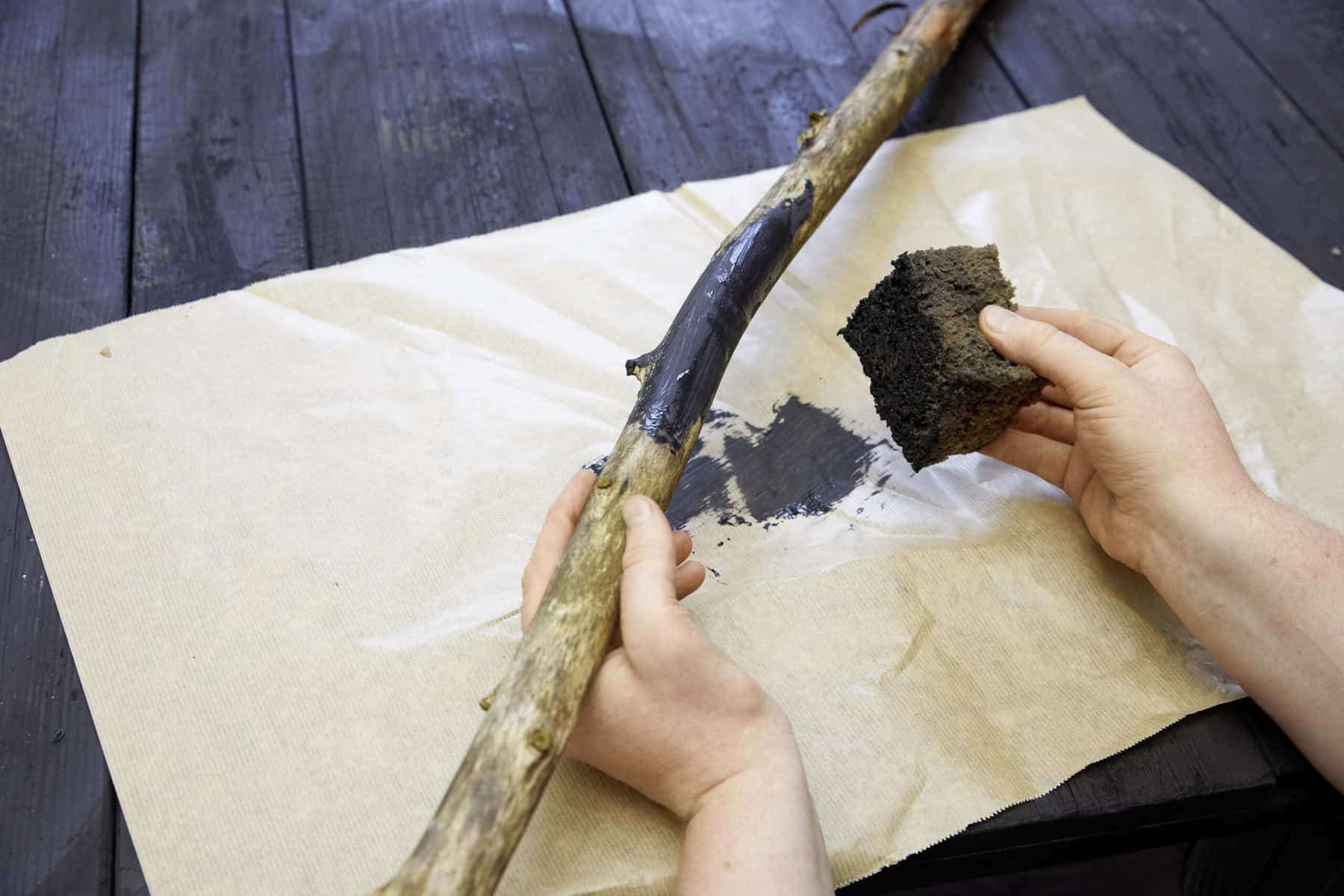 Äste mithilfe des Schwamms kolorieren und trocknen lassen. An mehreren Stellen Löcher einbohren. Splittstäbe in die Löcher stecken. Die Äste quer über die beiden bepflanzten Gefäße legen und dabei die Splittstäbe im Pflanzsubstrat verankern.