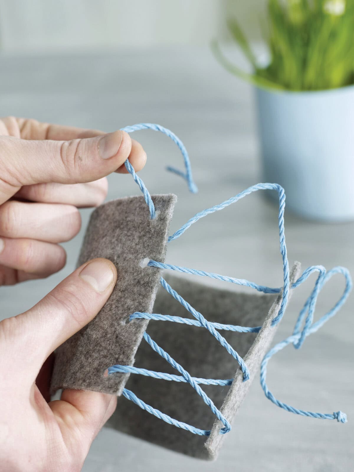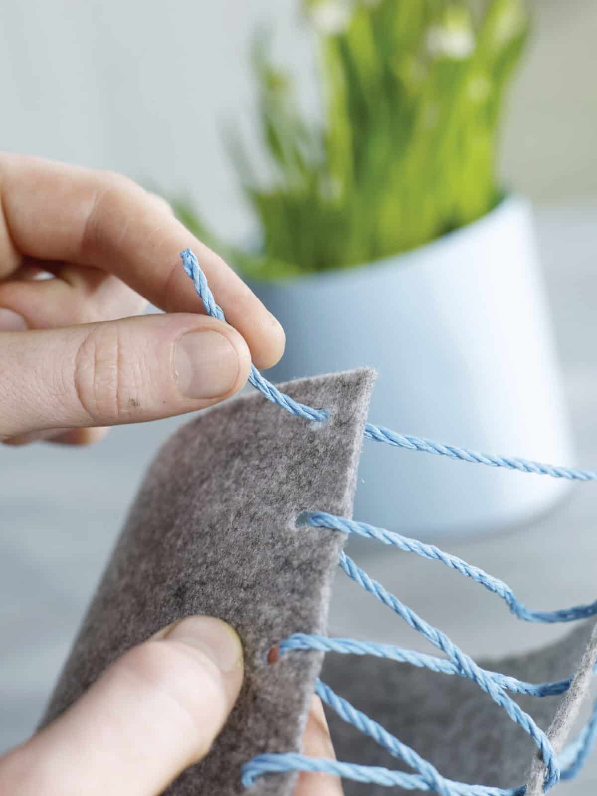 Breite Filzstreifen an den kurzen Seiten mittels eines Lochstanzers lochen. Eine dicke Kordel durch die Löcher fädeln. Dabei immer ein Loch links und dann wieder rechts nutzen, sodass ein Kreuzmuster entsteht. Den Filz um den Topf legen und locker zuschnüren.