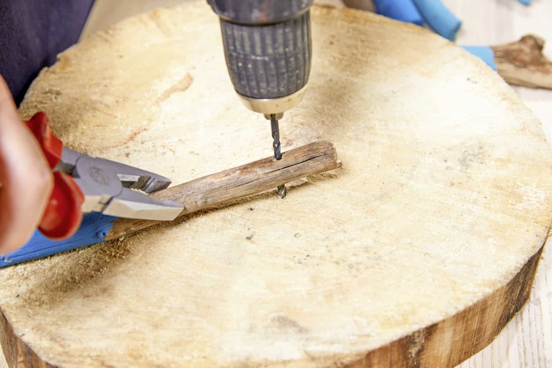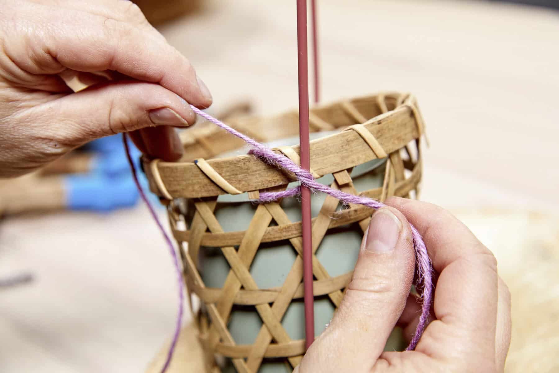 Das Gefäß in einen Korb einsetzen und eine Schnur durch die Löcher fädeln. Diese wird dann an einen Dekoring geknotet. Danach können die Treibhölzer in einer Farbe eurer Wahl koloriert, mithilfe einer Bohrmaschine im unteren Bereich durchlöchert und anschließend auf einen Steckdraht aufgefädelt werden. Nachdem die Hölzer am Korb befestigt wurden, kann die Pflanze eingesetzt und ein Band als Aufhängung angeknotet werden.