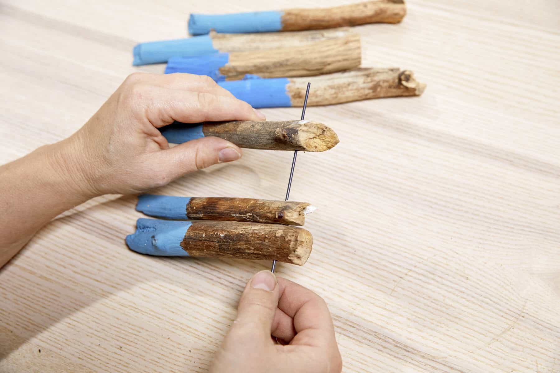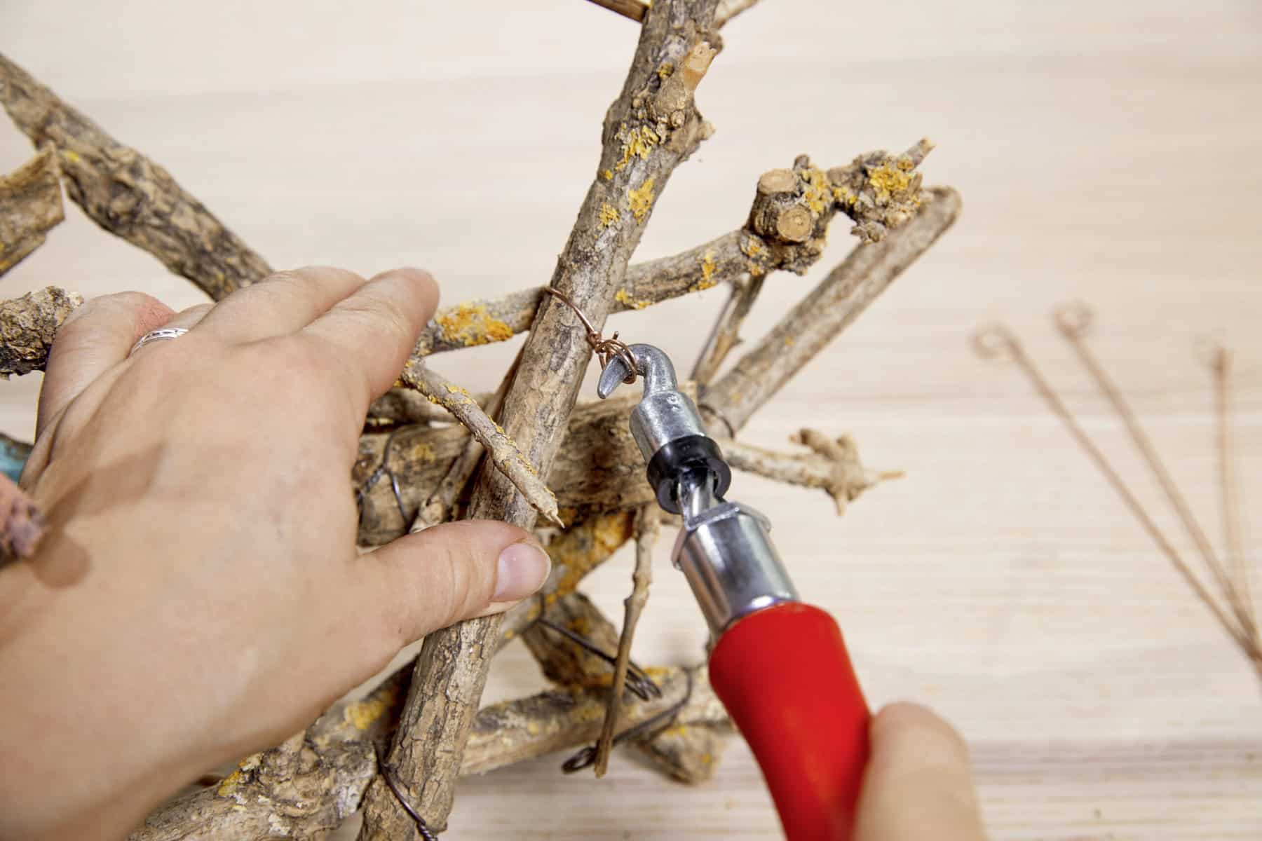 Mithilfe des Twisters und Twistdrahts ein Grundgerüst aus Ästen herstellen. Danach einen Teil der Äste mit Abtönfarbe streichen und gut trockenen lassen. Jetzt kann das Zebrakraut oder eine andere Pflanze eurer Wahl in das Gerüst eingesetzt werden. Blaue Schnüre, passend zur Farbe der Äste, dienen als Aufhängung.