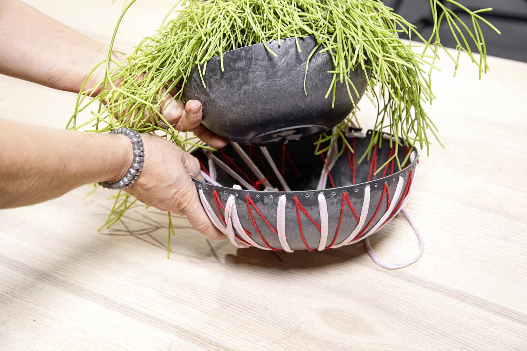 Mithilfe einer Bohrmaschine Löcher sowohl in den Schalenrand als auch in den Schalenboden bohren. Nun abwechselnd Kordel, Stoffstreifen und Schnur durch die Löcher einflechten, sodass ein interessantes Muster auf der Außenseite der Schale entsteht. Dabei dienen vier Schnüre später als Aufhängung. Zum Schluss den Korallenkaktus in eine weitere Schale pflanzen und in das zuvor bearbeitete Gefäß einsetzen.
