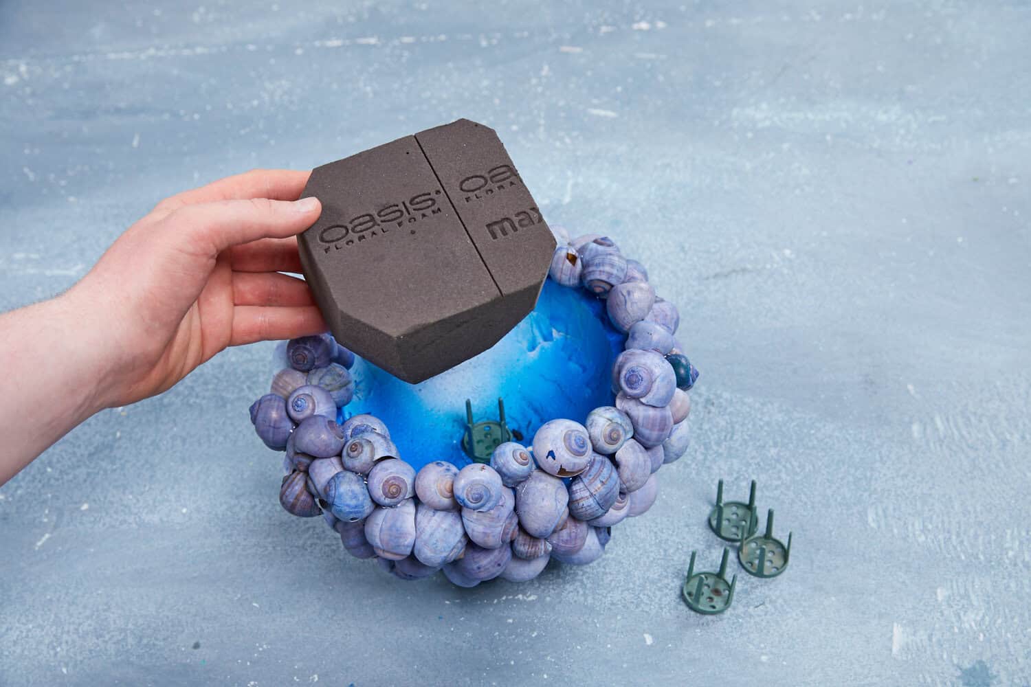 Zunächst die Schale kolorieren und gut trocknen lassen. Dann mithilfe von Heißkleber die einzelnen Schneckenhäuser dicht an dicht auf der Außenseite der Schale befestigen. Einen Pinholder in der Schalenmitte anbringen und darauf den gewässerten Frischblumensteckschaum platzieren. In diesen die verschiedenen Blüten einstecken.