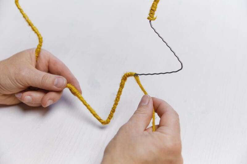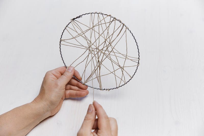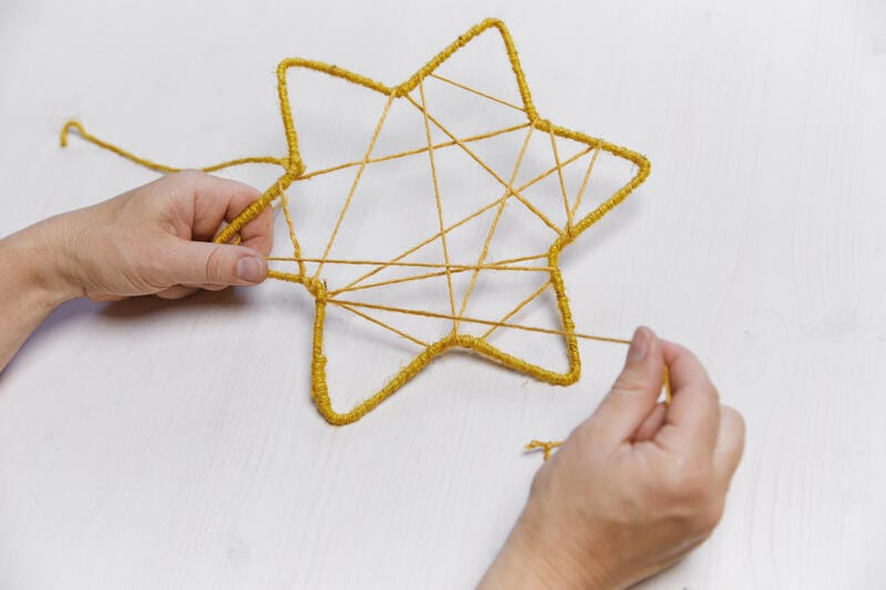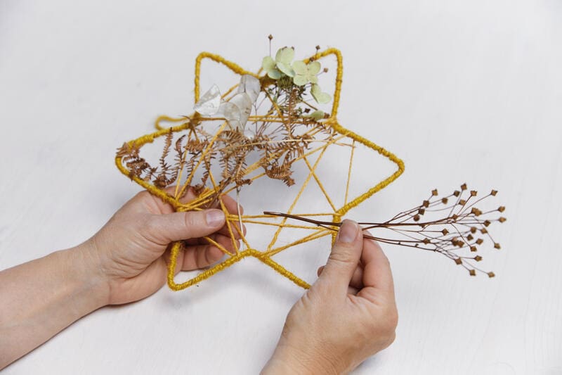 Protee, Hortensie, Riesen- Lauch und Dill zu einem Strauß binden. Dann den Wellendrahtstern mit Schnur umwickeln. Nachdem der Rahmen umwickelt wurde, den Stern kreuz und quer mit Schnur bespannen. Dadurch ergibt sich ein Netz, in das die übrigen Floralien wie Wurmfarn und Silberblatt eingeklemmt werden können. Mit einer Schnur kann die Dekoration am Strauß befestigt werden.
