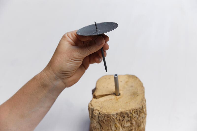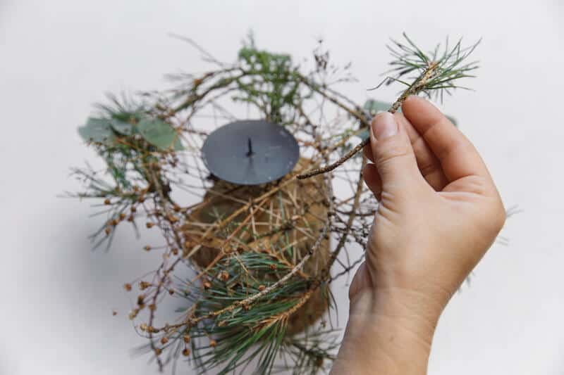 Ein Loch in das Holzstämmchen bohren, ein Aluhohlrohr passend zurechtschneiden und in das gebohrte Loch einkleben. Den Kerzenhalter daraufsetzen. Nun einen Wellendrahtring mit Papierwickeldraht kreuz und quer bespannen. Den bespannten Wellendrahtring über den Kerzenhalter stülpen. Danach können die floralen Werkstoffe in das Drahtgeflecht eingewebt werden. Die Schnur anknoten und ein Glasröhrchen mithilfe von Papierwickeldraht am Werkstück befestigen. Nachdem es mit Wasser aufgefüllt wurde, kann die Christrose ergänzt werden.