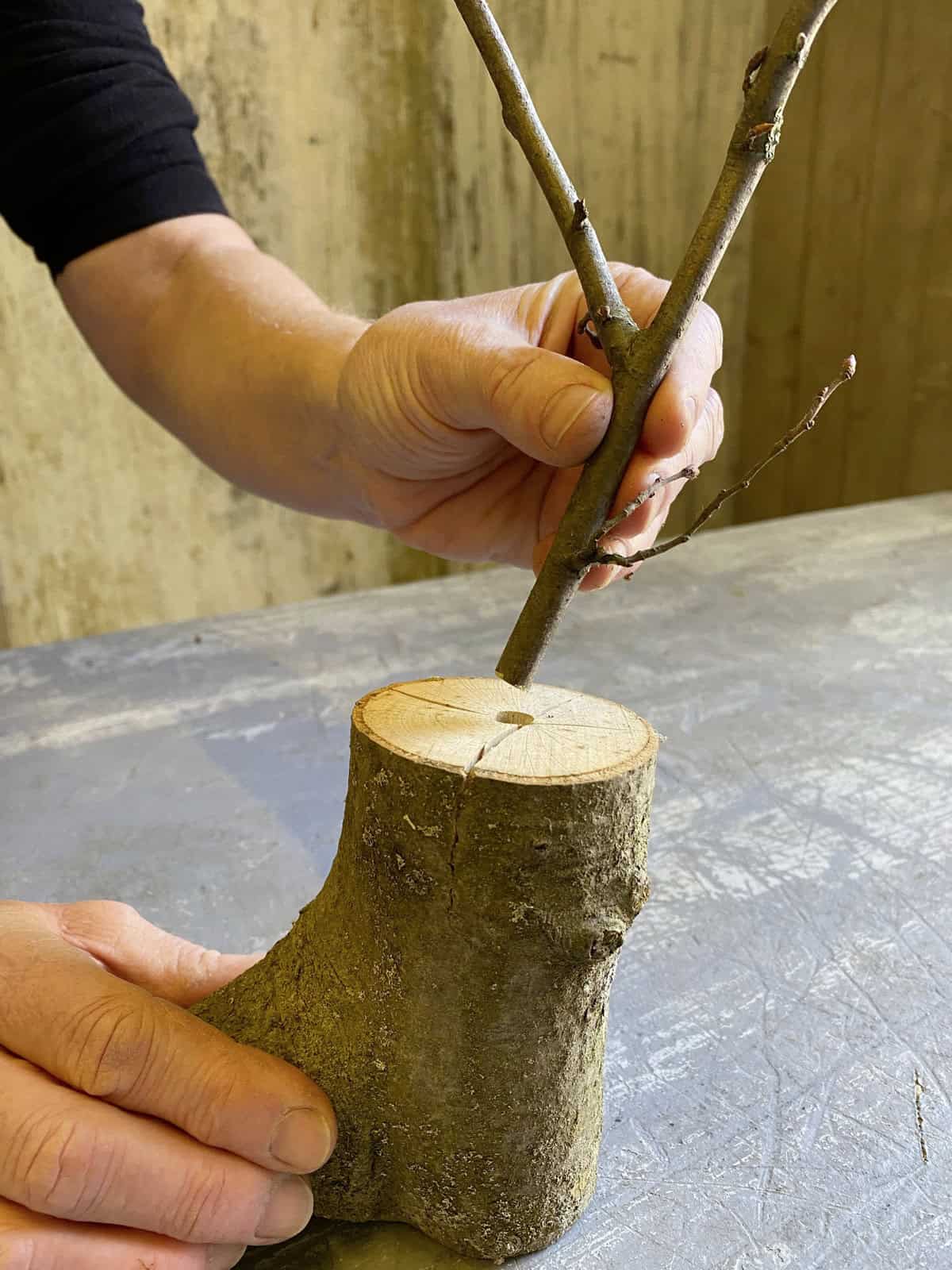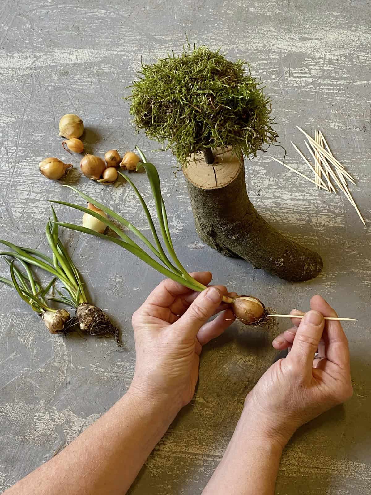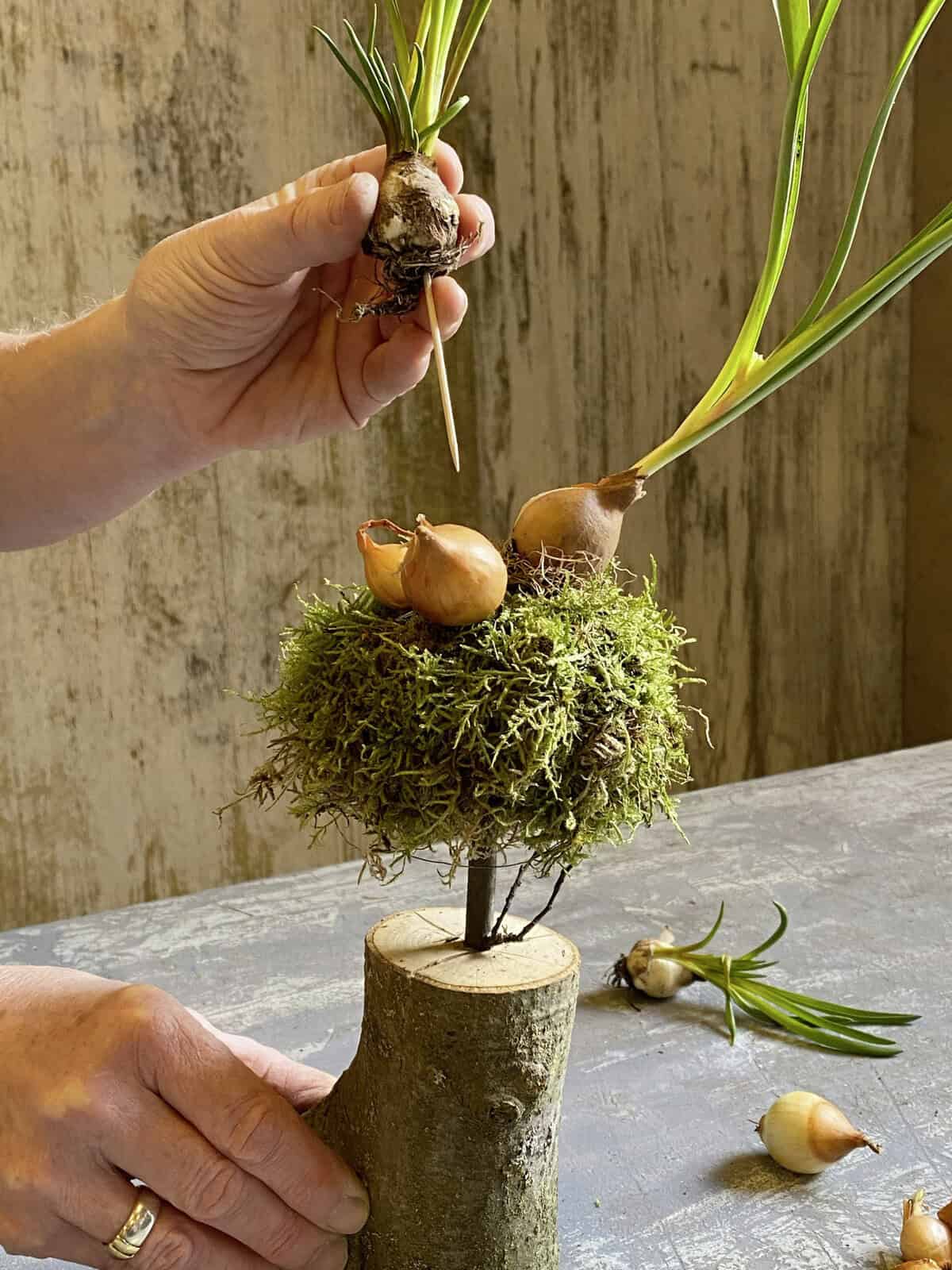 Buchen-Aststücke in die gewünschte Länge sägen und mithilfe einer Bohrmaschine ein Loch mittig ins Stirnholz bohren. Ein passendes, verzweigtes Ästchen einklemmen. Moos mithilfe von Myrtendraht zu einem flachen Ball formen und diesen in die Astgabelung oder auf den Ast stecken und fixieren. Die Zwiebeln auswaschen, jeweils einen Zahnstocher hineinstecken und in die Mooskugel integrieren.