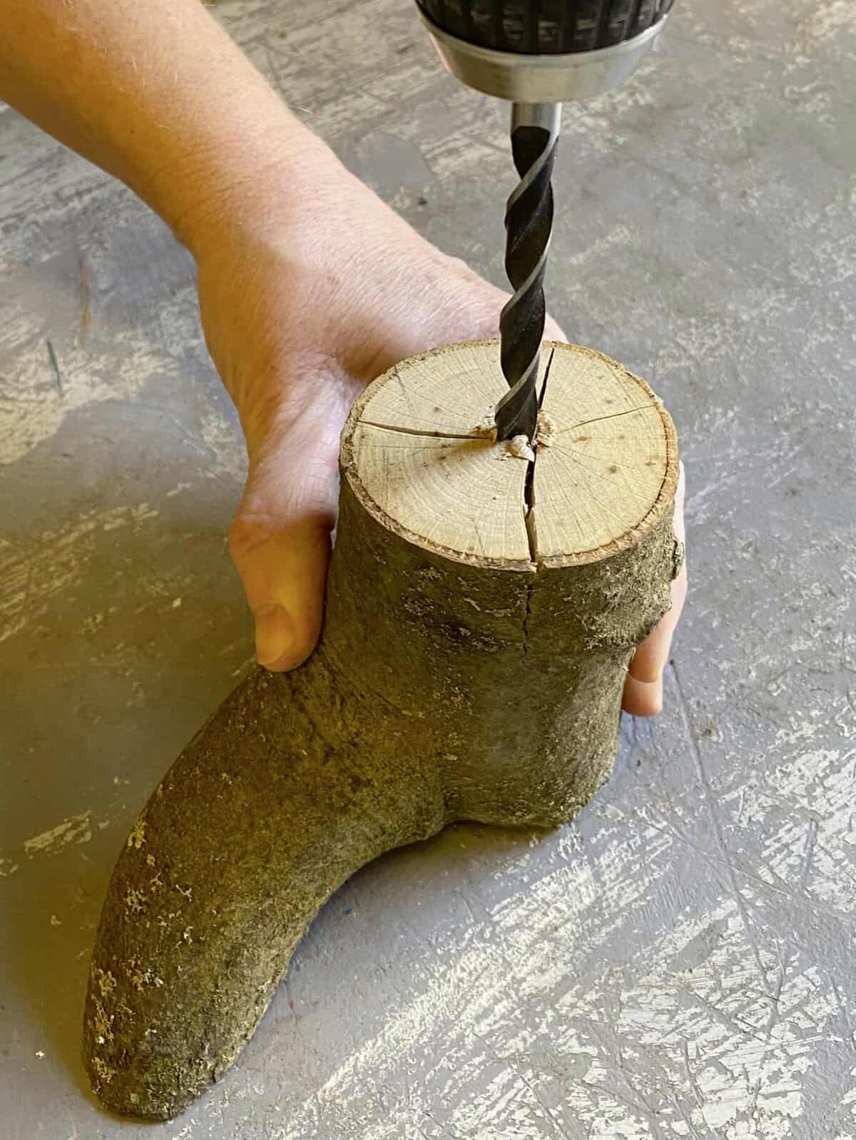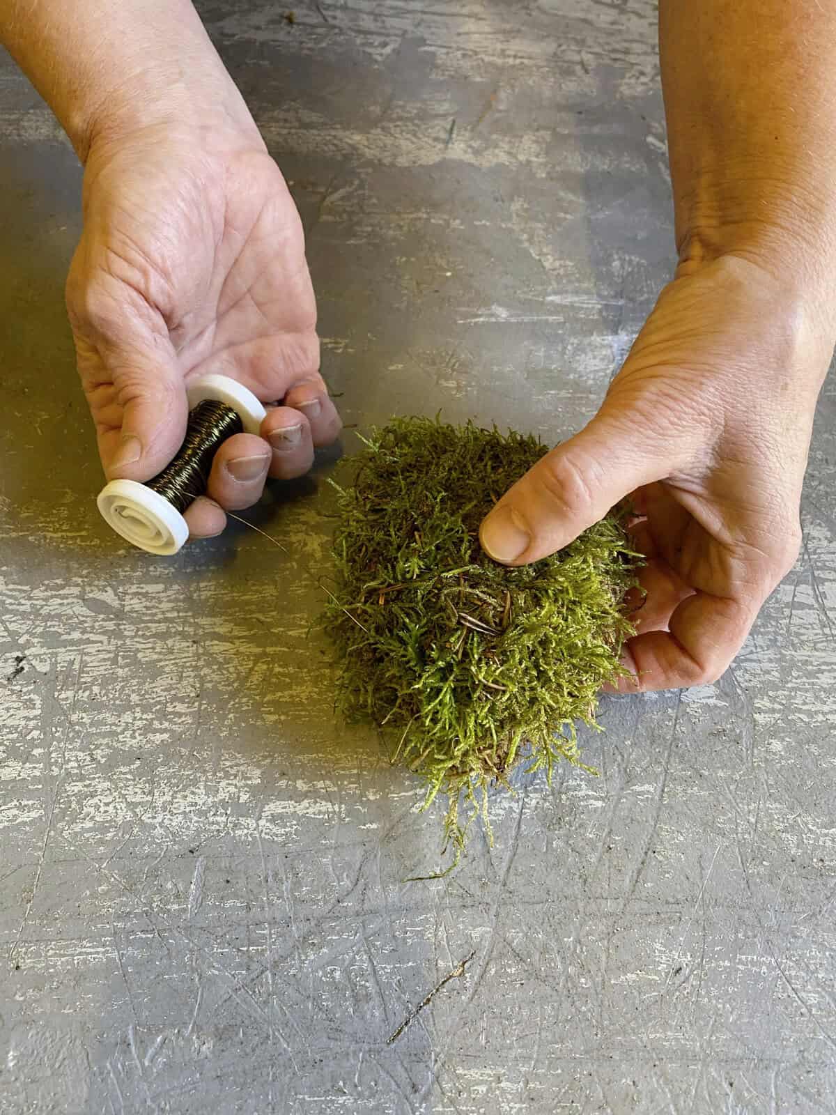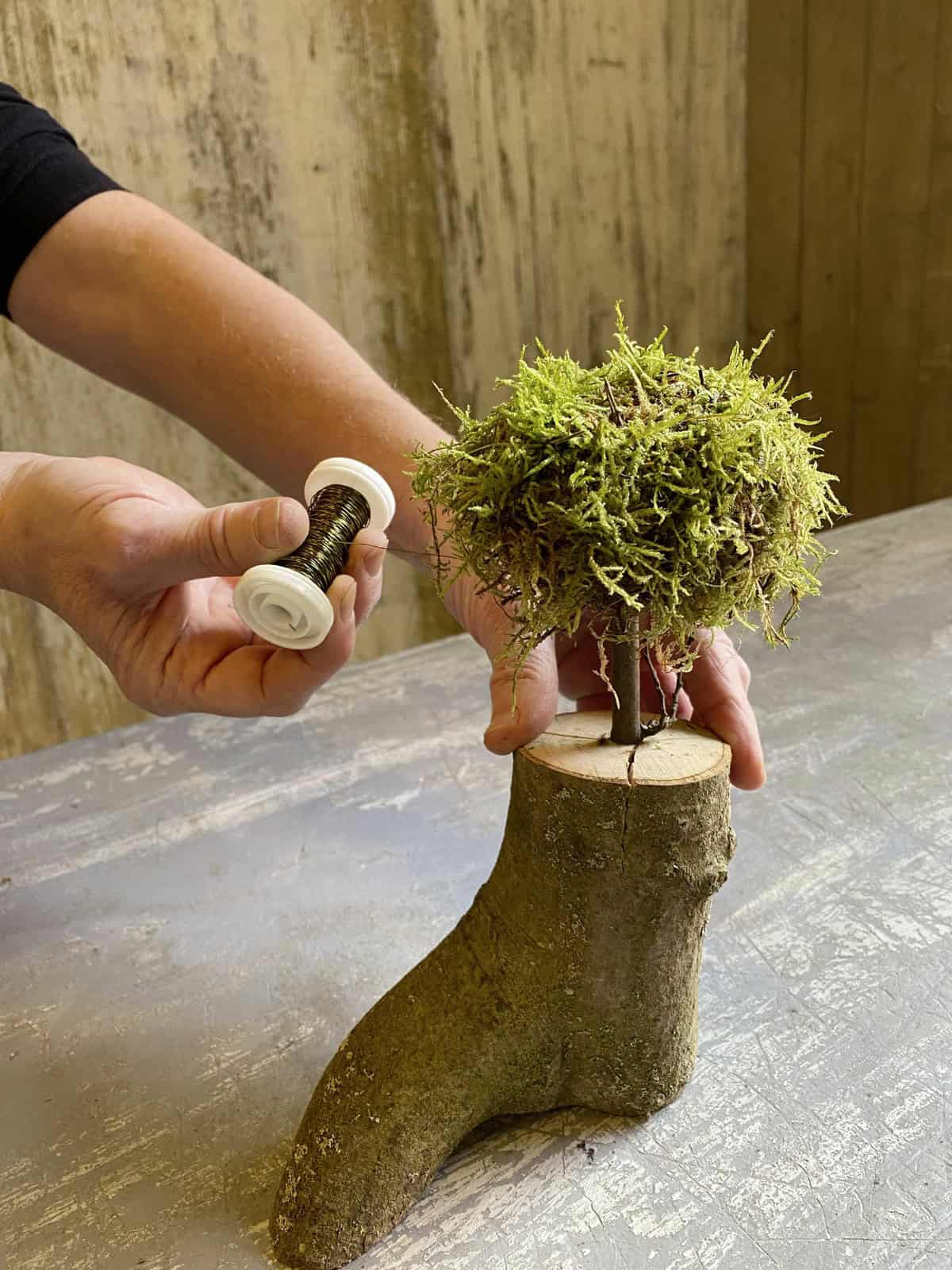 Buchen-Aststücke in die gewünschte Länge sägen und mithilfe einer Bohrmaschine ein Loch mittig ins Stirnholz bohren. Ein passendes, verzweigtes Ästchen einklemmen. Moos mithilfe von Myrtendraht zu einem flachen Ball formen und diesen in die Astgabelung oder auf den Ast stecken und fixieren. Die Zwiebeln auswaschen, jeweils einen Zahnstocher hineinstecken und in die Mooskugel integrieren.
