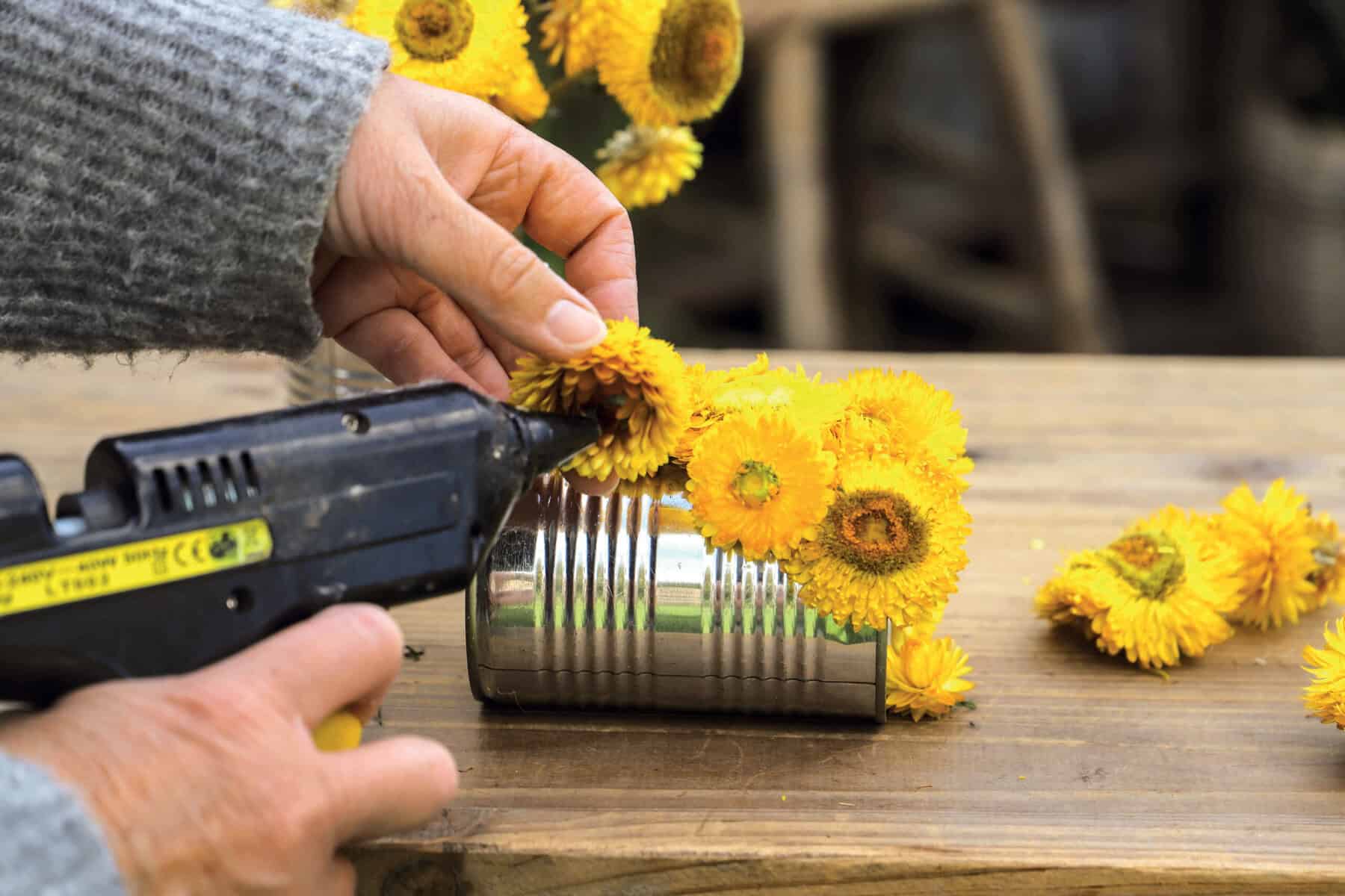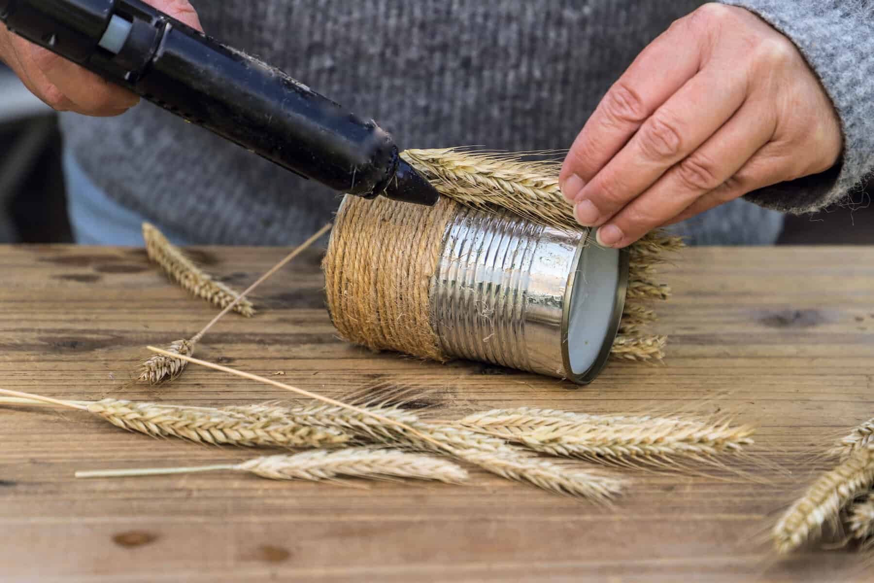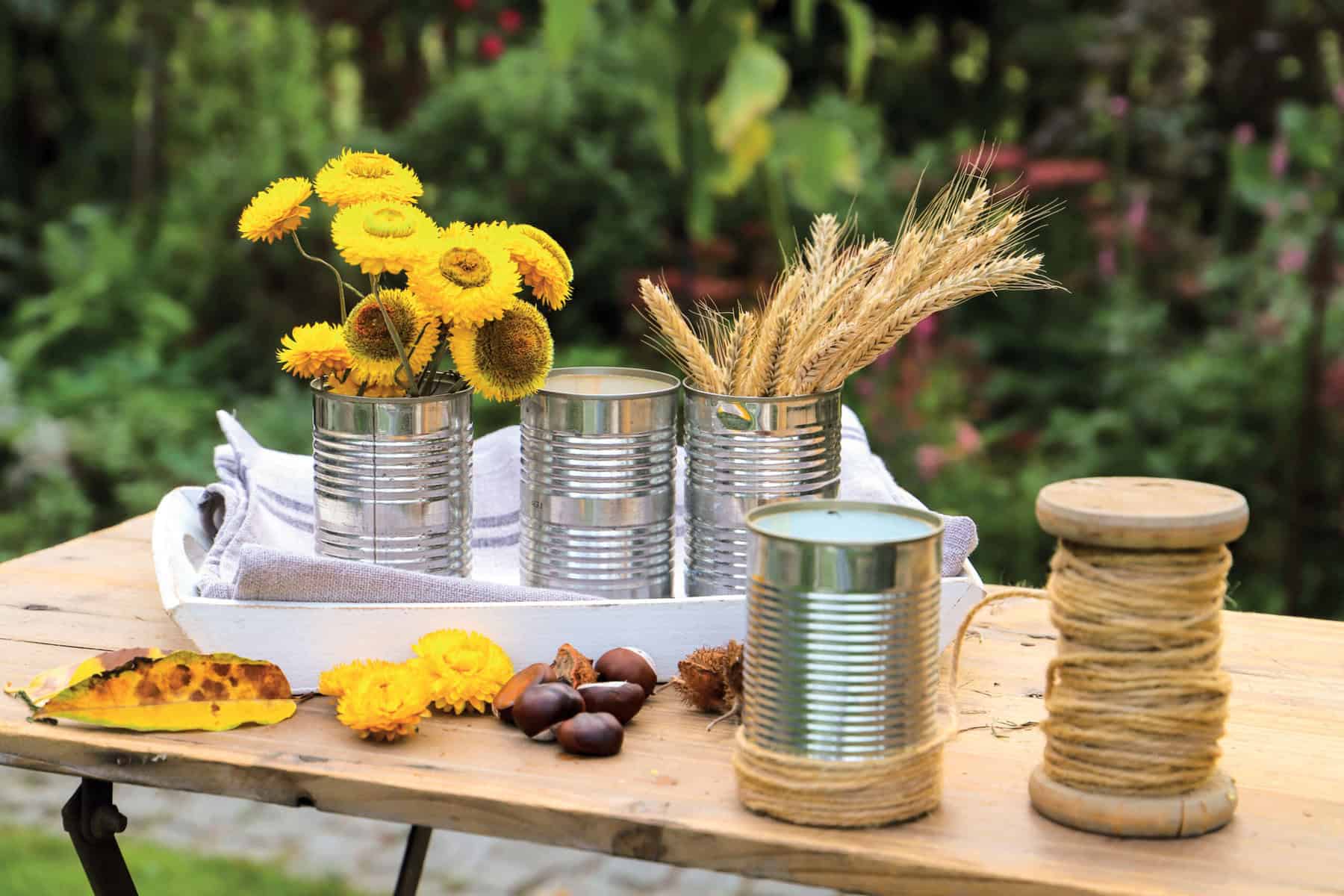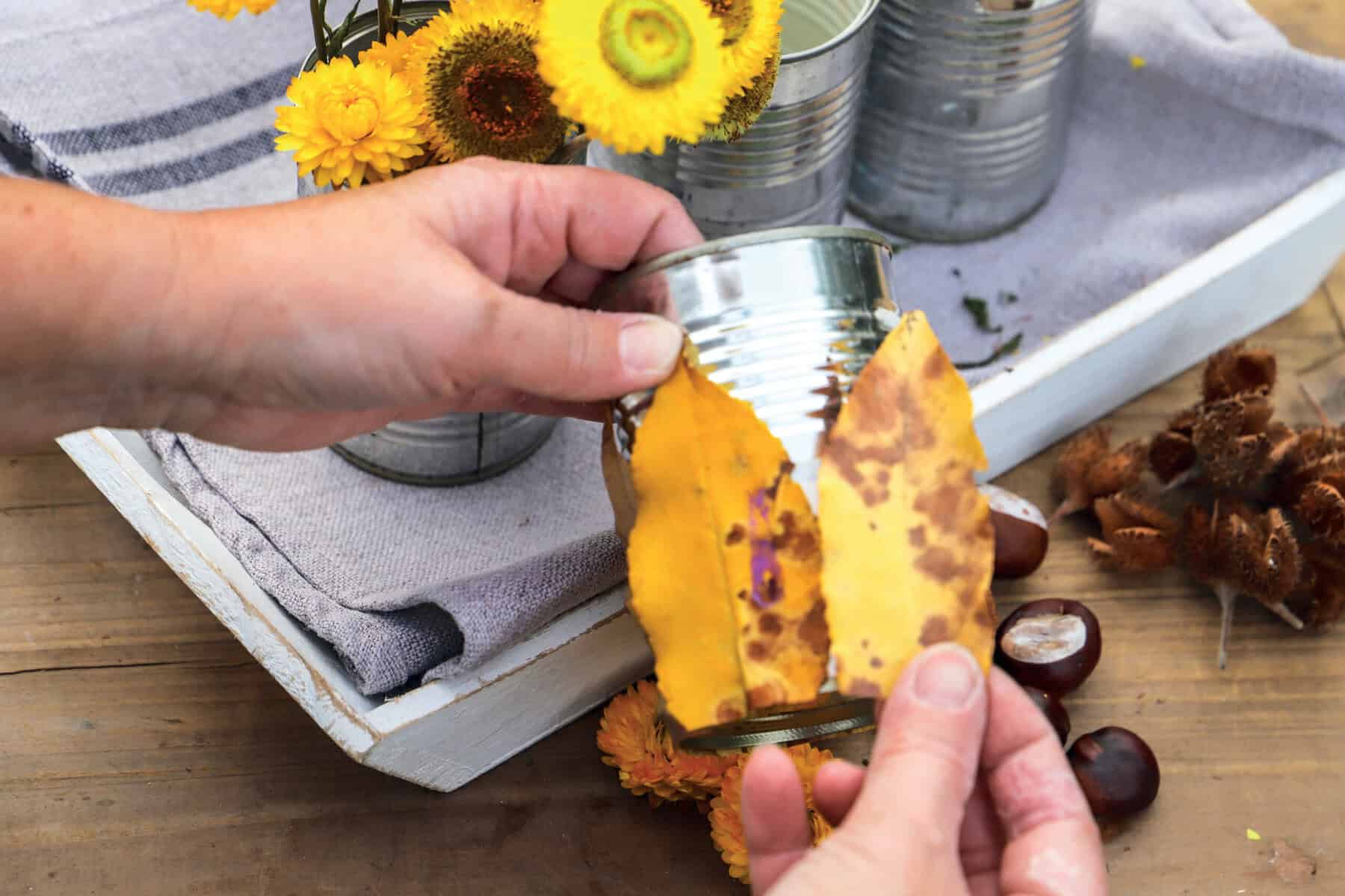 Legt euch alle Materialien bereit, damit ihr direkt loslegen könnt. Zunächst die Banderole der leeren und gesäuberten Konservendosen entfernen. Falls ihr keine alten Dosen habt, könnt ihr auch ausrangierte Marmeladengläser verwenden. Dann die Dosen mithilfe von Heißkleber mit Laub, Strohblumen und Bucheckern bekleben, sodass sie rundherum bedeckt sind. Eine weitere Dose zunächst mit Juteschnur umwickeln, dann die Getreideähren aufkleben. Die Dosen mit Wasser füllen und verschiedene Blumen und Gräser einstellen. Die Floralien in den Dosen könnt ihr nach Belieben austauschen und die selbstgemachten Dosen nach Lust und Laune woanders platzieren.