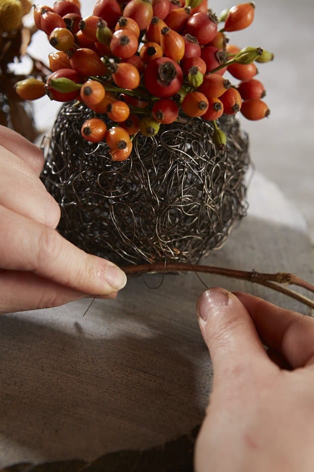 Die Steinplatte mit den Ranken umlegen und das Ganze mit Wickeldraht fixieren. Nun die Kugeln aus Wickeldraht formen. Anschließend Wasserröhrchen in die Kugeln stecken und mit Wasser befüllen. Dann die Blüten in die Kugeln stecken und diese mittels Wickeldraht mit den Ranken auf der Steinplatte verbinden. Anschließend Floralien einstellen. Zum Schluss die Kugeln mithilfe von Wickeldraht mit den Ranken auf der Steinplatte verbinden und Laub auf dem Arrangement dekorieren.