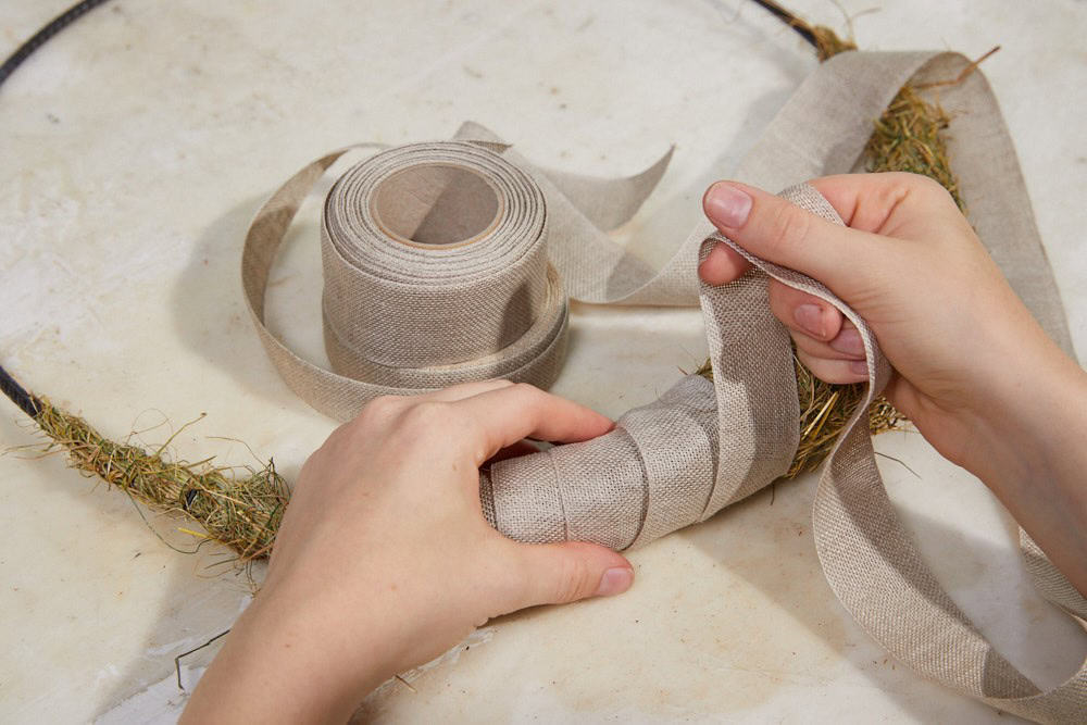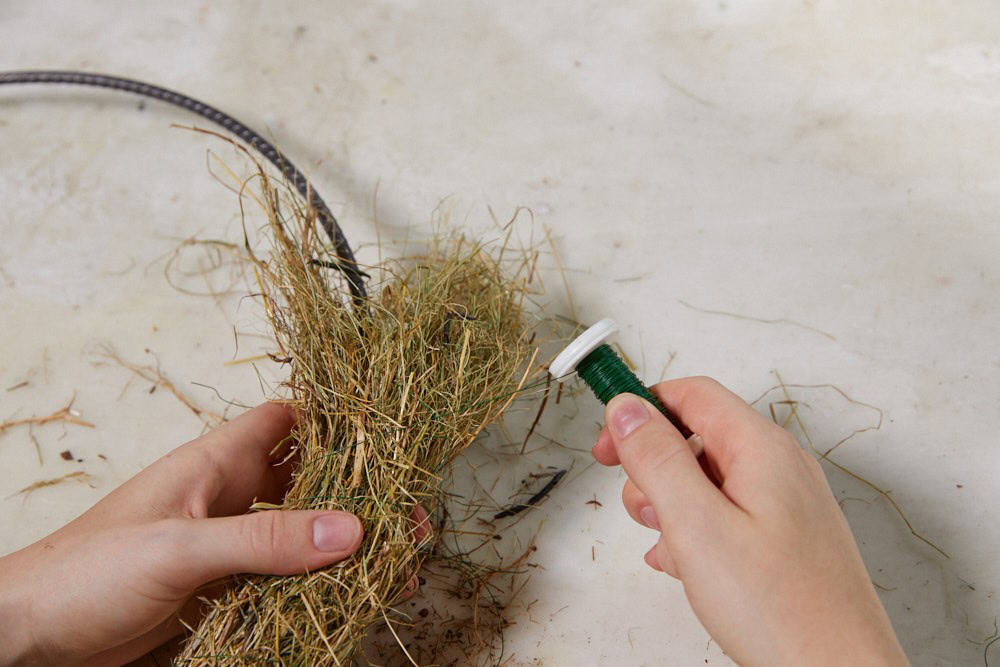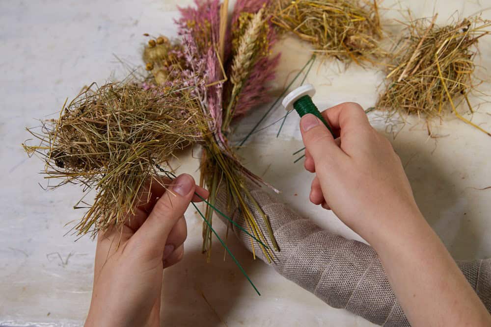 Im ersten Schritt das Heu teilweise auf den Ring wickeln. Dabei eine sichelförmige Verdickung herausarbeiten. Nun den Ring komplett mit dem Band abwickeln. Anschließend Heu bündeln und mit Draht andrahten. Im nächsten Schritt die sichelförmige Verdickung von beiden Seiten mit Trockenblumen bewickeln. Die Heubündel dienen dabei zum Auffüllen. Den Bereich, in dem die Stiele zusammenkommen, großflächig mit Heubüscheln ausfüllen. Hier werden die Materialien ins Heu eingeklebt. Zuletzt noch ein Stück Band am oberen Kreis befestigen. Dieses dient als Aufhängung.