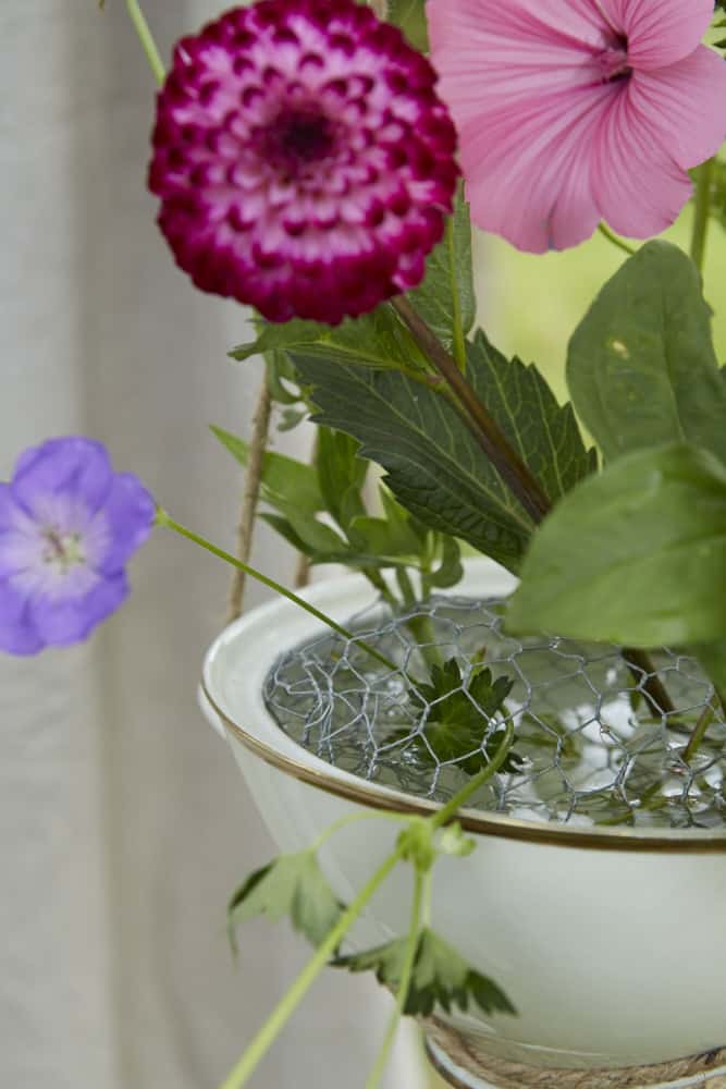 Hasendraht // Suppenterrine // Seitenschneider // Jutekordel // Wickeldraht // Blüten (wie Bechermalven, Zinnien, Dahlien, Storchenschnabel und Spornblumen)