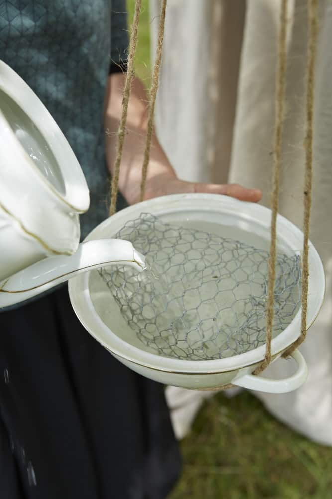Hasendraht mithilfe eines Seitenschneiders zurechtschneiden, leicht einrollen und in die Terrine setzen. Im Anschluss Wasser einfüllen.