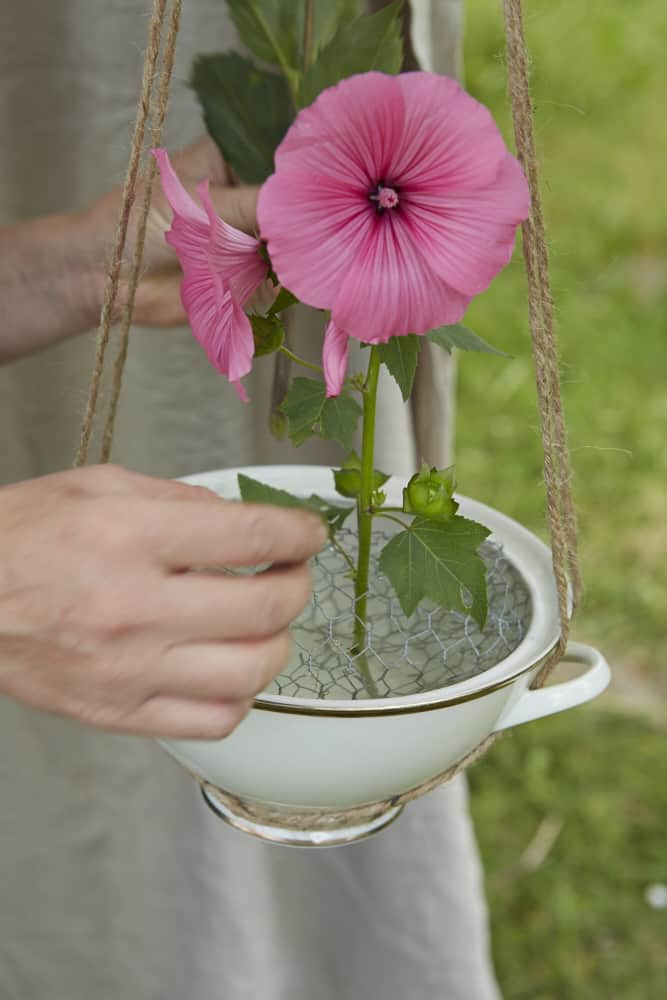 Omas ausgediente Suppenterrine kommt bei unserer DIY-Hängeampel mit leuchtend pinken, violetten und rosafarbenen Sommerblüher zu neuen Ehren. Sie hält mit Wasser gefüllt, alle Blüher frisch. Wir zeigen euch, wie ihr für diese Dekoration eine natürliche Steckbasis erstellt und die Blumenampel kreiert. Seid gespannt!