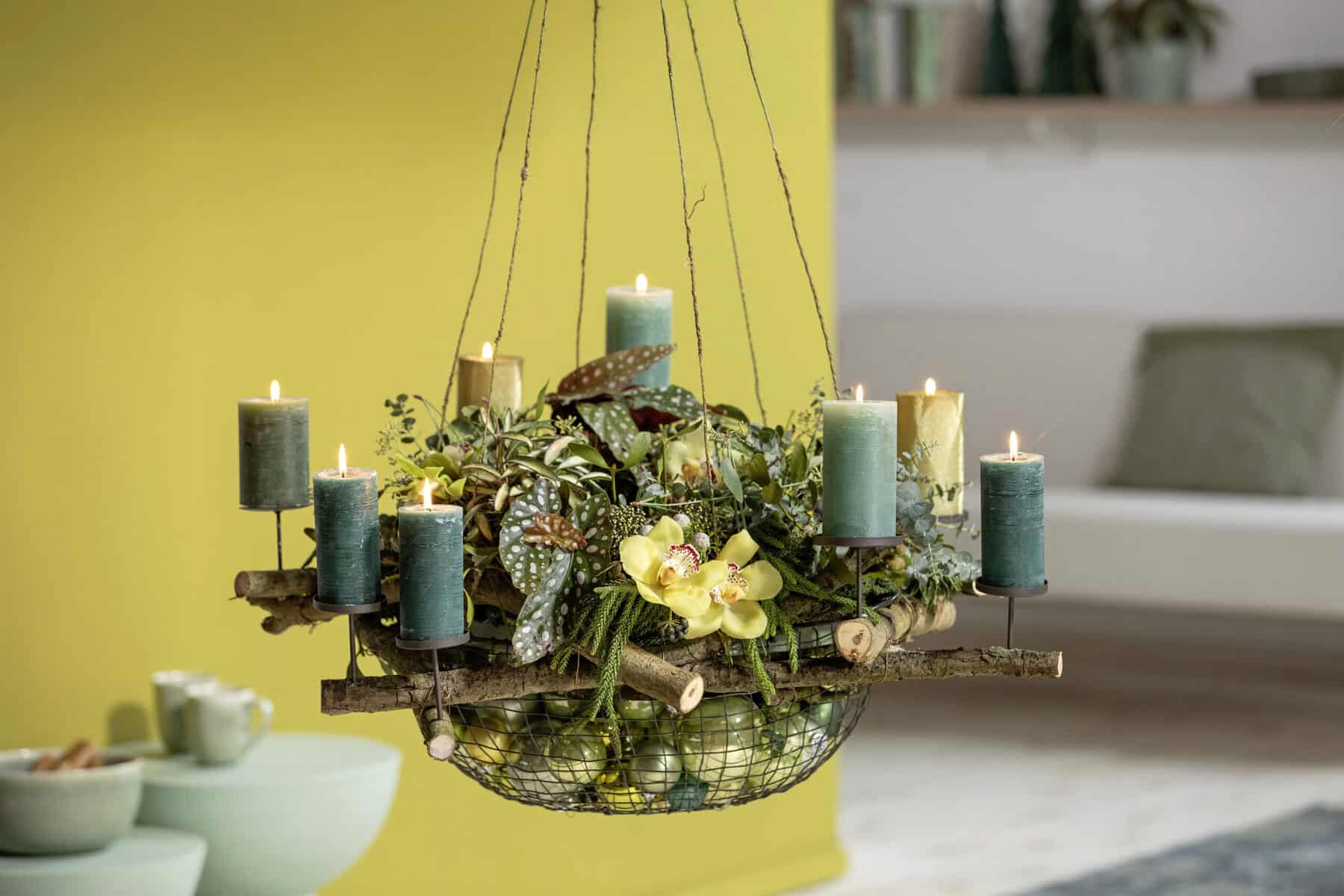 Die Äste passend zuschneiden und mithilfe des Twisters an den Drahtkorb rödeln. Im Innenbereich am Rand eine Auflagefläche für den Frischblumensteckschaum-Ring schaffen, im Außenbereich die Äste lang genug lassen, um die Kerzenhalter im sicheren Abstand zum Ring zu befestigen. Frischblumensteckschaum-Ring wässern, in den Drahtkorb legen und Teilstücke für die Kokedamas herausschneiden. Anschließend eine Aufhängung anbringen und die Pflanzen zum Kokedama verarbeiten. Den Drahtkorb im inneren Bereich mit Kugeln füllen. Die Kokedamas in den Kranzaussparungen einklemmen und mit Steckdrähten fixieren. Danach die Floralien in den Ring stecken. Löcher für Kerzenhalter in die Äste außerhalb des Korbs bohren und gruppieren, abschließend die Kerzen ergänzen.