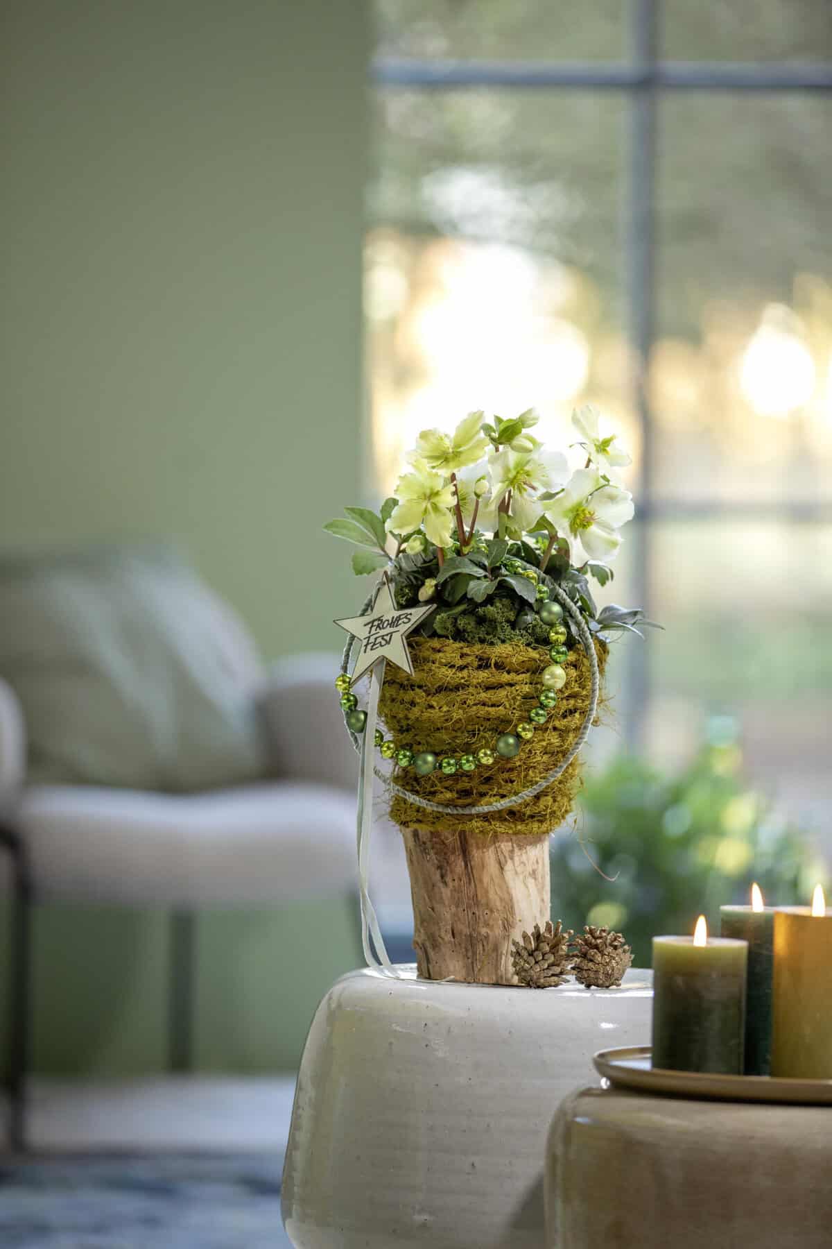 Den Tontopf auf einen Holzstamm schrauben. Danach den Sisalstrick um den Tontopf wickeln, dabei ab und an mit Heißkleber fixieren. Den Übergang vom Holzstamm zum Sisalstrick mit Malerkrepp abkleben und den Sisalstrick mit Farbe kolorieren und trocknen lassen. Die Christrose mit Untersetzer einstellen und die sichtbare Erde mit etwas Islandmoos abdecken. Anschließend den Wellendrahtring mit Band abwickeln und beide Enden des Bandes lang lassen. Dann die Kugelkette auseinanderschneiden, den kleineren Wellendrahtring aufschneiden. Die Kugeln aus Kette auf den Wellendrahtring auffädeln und den Ring an den Enden schließen. Schließlich den Kugelring mit den langen Bandenden an den Bandring binden und an der Christrose anbringen. Den Holzstern kolorieren, beschriften und an dem Band anbringen.