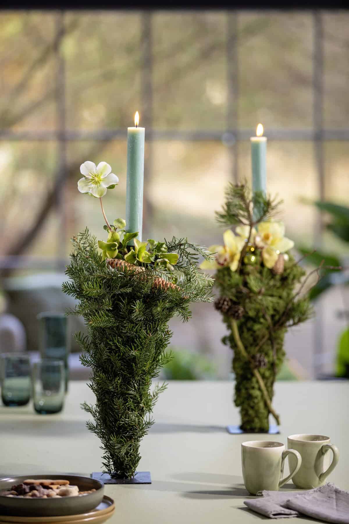 Ein auf den Kopf gestellter Trockenblumensteckschaum-Kegel wird zur stilvollen Leinwand für moosige Texturen, edle Nordmanntanne und festliche Details. Der integrierte Kerzenhalter in der breiten Oberseite schafft einen ruhenden Mittelpunkt, während Kugeln, Zapfen und Blüten das Arrangement elegant abrunden.