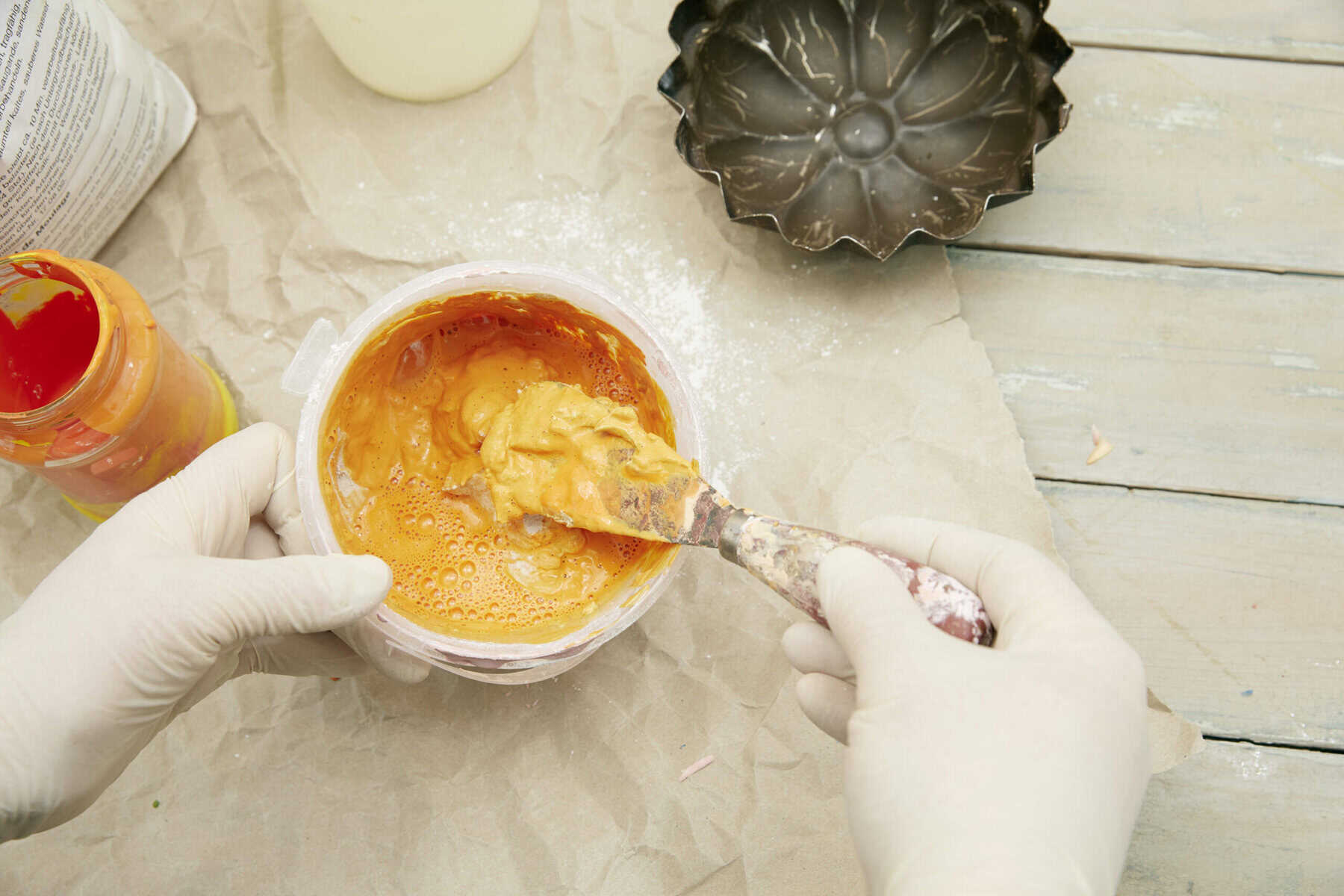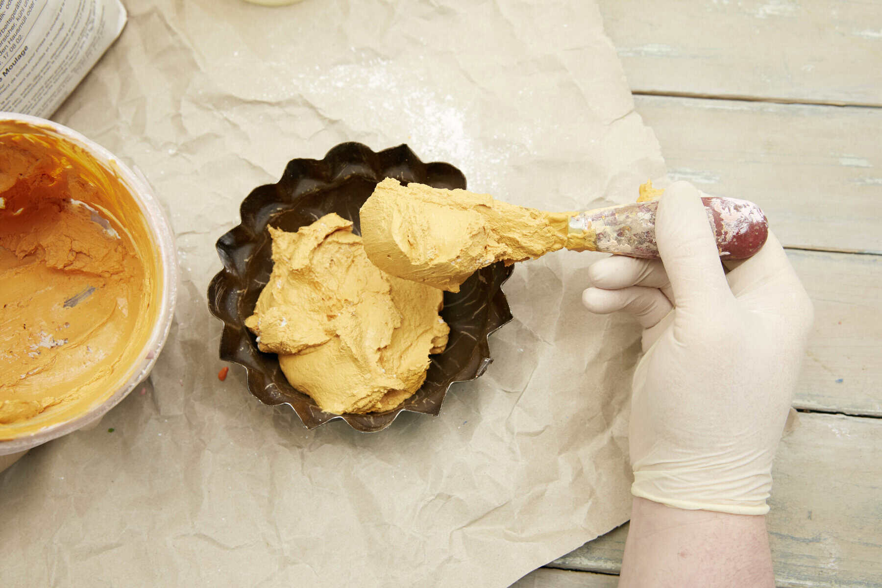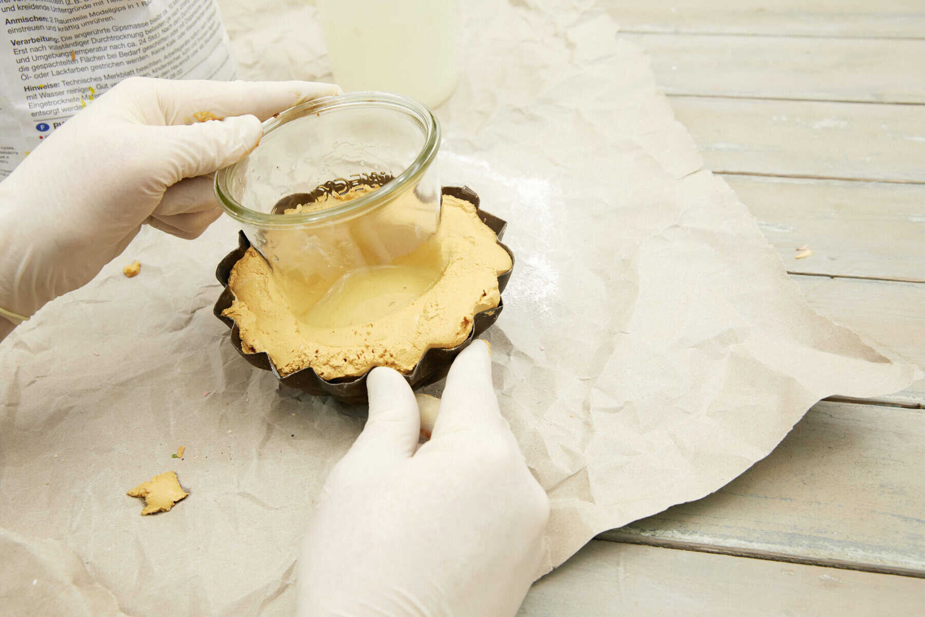 Den Gips anrühren und mit der Abtönfarbe einfärben. Die Mischung in eine mit Blattglanz gefettete Form geben. Mittig ein Glasgefäß in die Masse drücken und trocknen lassen. Nach dem Trocknen die Form entfernen, das Glasgefäß mit Wasser sowie Blüten füllen und einen Herzanhänger mit Schnur anknoten.