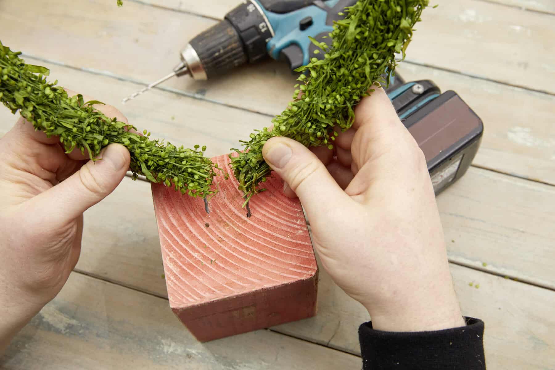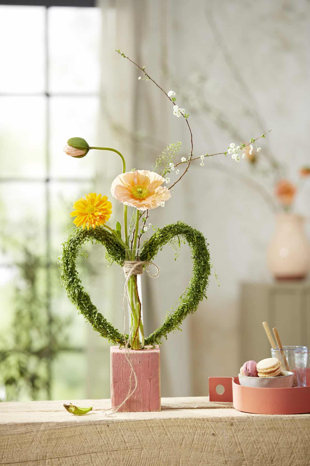 Den Holzklotz farbig anstreichen und trocknen lassen. In der Zwischenzeit den Wellenring aufschneiden und zu einem Herz biegen, das unten offen ist. Dieses mittels Draht mit Thlaspi arvense bewickeln. Zwei Löcher in den Holzklotz bohren und die beiden Enden des Drahtherzes dort einstecken. Ein Glasröhrchen mittig einfügen, festknoten und mit Wasser sowie Blüten füllen.